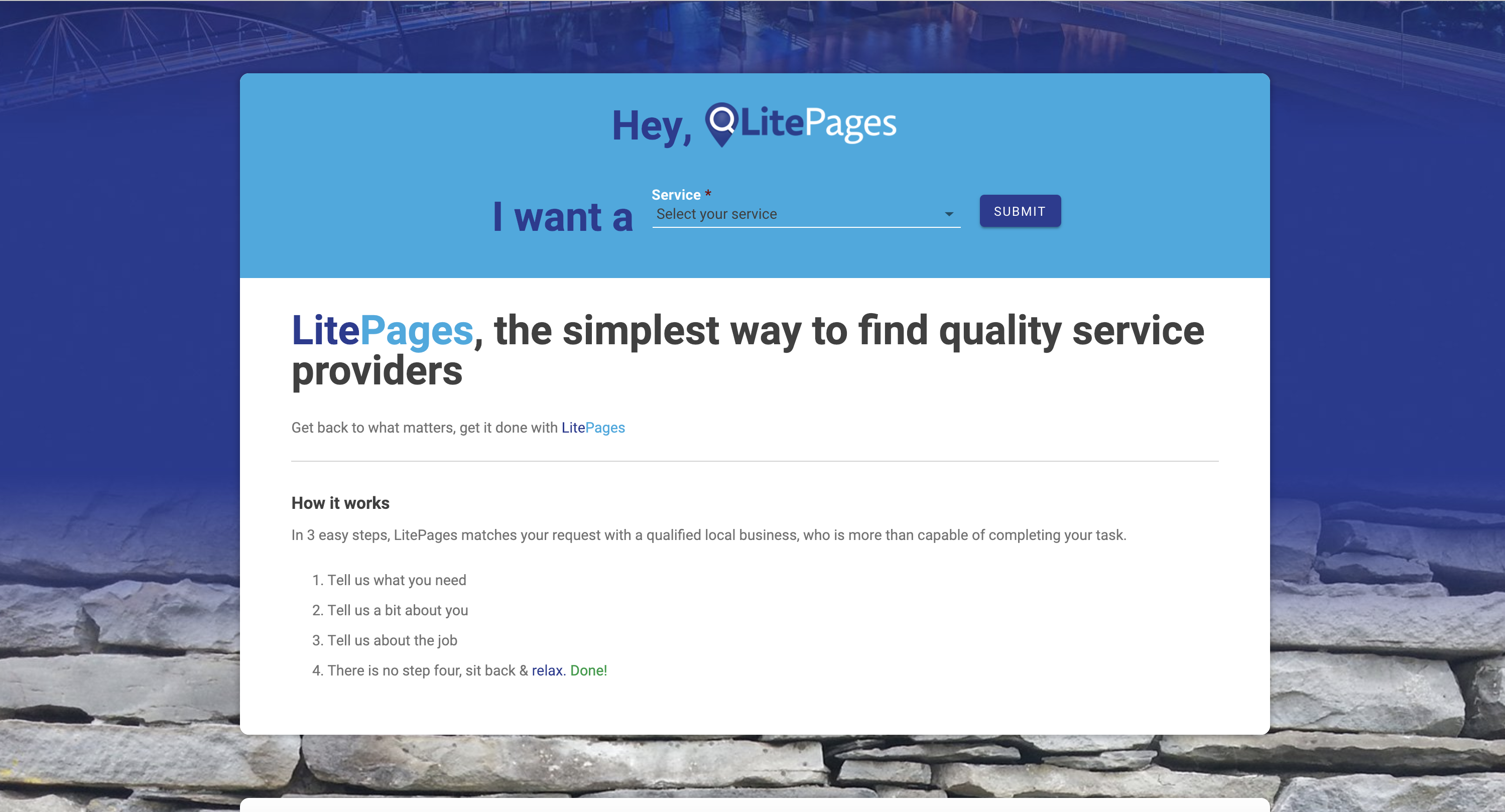 LitePages wants to make it easier for small businesses to utilise technology to smooth their business process and ultimately reach their goals sooner. We will achieve this by bringing strategies and technology already used by big companies to the small businesses all over the world. Directly, what big companies have been able to do with big-data and automation we will bring to the little guy. We are getting started by making digital marketing and customer acquisition easy as well as managing reviews and helping to action theses insights. So a business owner can spend more time working on their trade and less marketing what they do. We are only getting started and plan to have a product to automate most of the additional work such as staff logistics and accounting. While businesses are our customers, we offer a modern user experience for their customers on our site. For consumers in the market looking for a service, we can shave hours of the time it takes by matching them with a single perfect option for their needs. We help manage quality control and pricing to ensure an all-around positive experience is had by all. LitePages is invested in ensuring a great experience for all. We win only when our customers and their customers are happy. So get back to what you're doing and give us a go today.