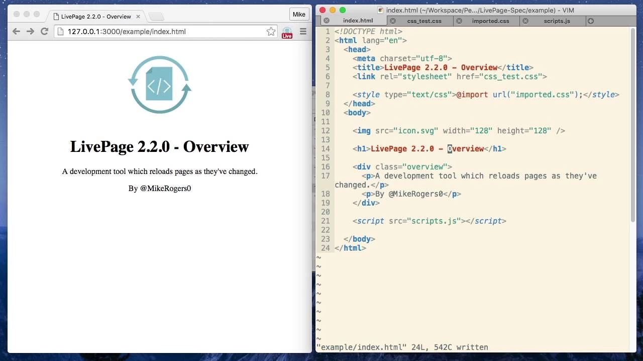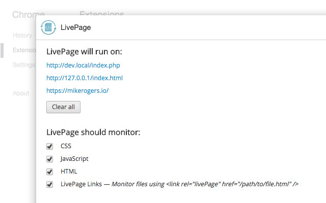LivePage reloads website resources such as CSS, HTML and JavaScript as they update on the server. LivePage is a developer tool which reloads website resources (such as CSS, HTML and JavaScript) as they update on the server, so you are always looking at the most up-to-date version of a web page. It can make developing websites a lot faster, by helping productivity. Features: * Entire domains can be made live * file:// protocol is now supported It's recommended you use this extension only in a local development environment and not in a production environment. All future milestones & current issues can be found on https://github.com/MikeRogers0/LivePage/issues
