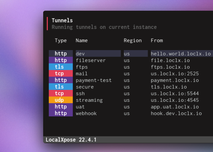 LocalXpose is a reverse proxy that enables you to expose your localhost to the internet with many features : - Unlimited Connections - HTTP/s, TLS, TCP and UDP Tunnels types - Custom domains - Wildcard domains - Custom endpoints - Request rate limiter - IP whitelisting - Edit request & response headers - Basic authentication - Key authentication - Built-in let's encrypt - Built-in file server - Many more....