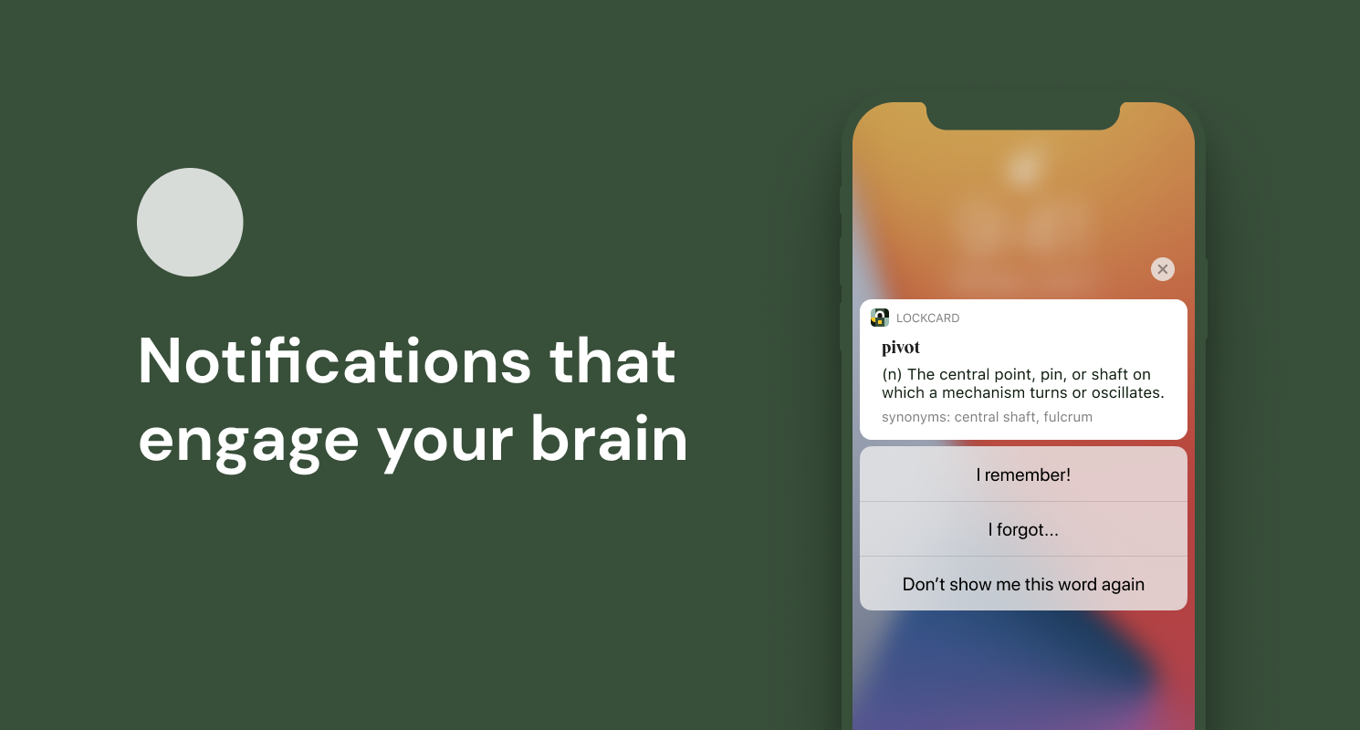 [Lockcard is a smart dictionary that uses your Iphone lock screen to test your memory] Look up a word you don’t know. Go back to your busy life. Receive a notification for that word. Test your memory from the lock screen. Repeat until you master it. SIMPLE Unlike traditional dictionaries, Lockcard shows you only the information you need, saving you time and making the searching experience prettier. EFFORTLESS Created automatically, personalized flashcard notifications come to you and engage your brain without even having to open the app. SMART The Lockcard algorithm is based on cognitive studies, proven to help consolidate your learning into long-term memory. -- LockcardApp BETA will be available starting November 2020 --