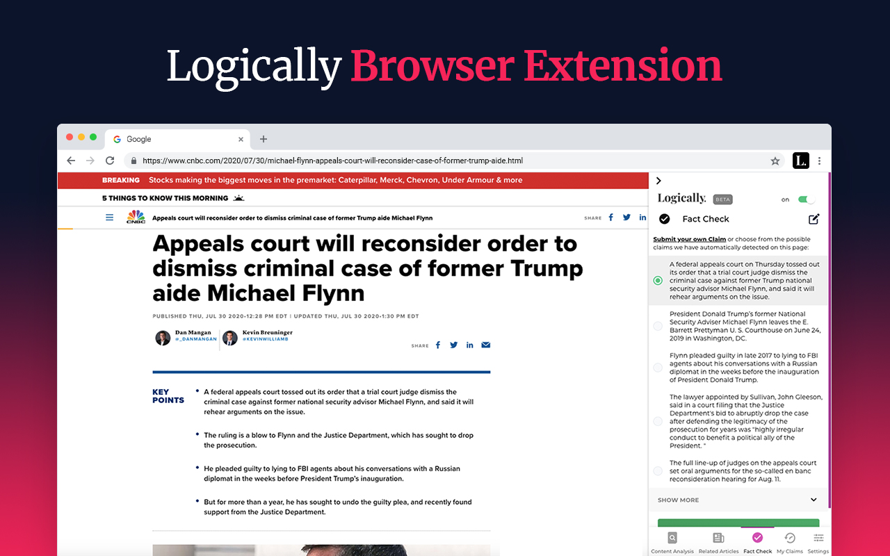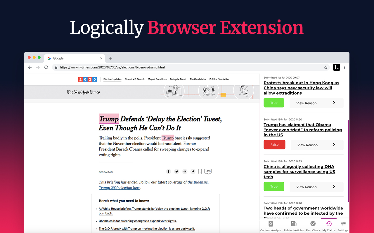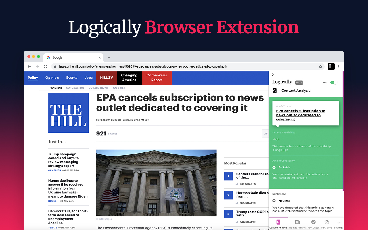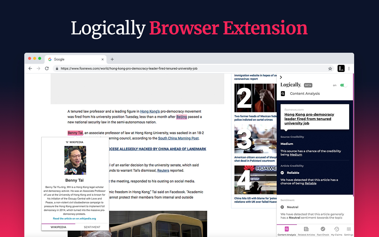 The Logically Browser Extension warns you of unreliable articles and sources and contextualizes the news as you read it, with reliable articles from over 100,000 publishers. It identifies toxic commentary on social media and highlights or hides it from your feeds based on your personal preferences, so that you can take back control of what you see and how you spend your time. Through the extension, you can also access our express fact checking service to help you assess any suspicious claims. Join the fight against fake news with the brand new Logically Browser Extension. • Check Source Credibility Source Credibility rates a publishers' credibility using Logically's advanced AI algorithms. • Check Article Credibility Our AI uses a range of misinformation indicators that identify particular kinds of reliable or unreliable information and make a prediction on an article's credibility. • Instantly Find Key Players The Key Players feature allows you to learn about the most important people, places and concepts mentioned within an article while you read it. • Check Writer Sentiment Our Sentiment Analysis technology detects the writers' general view on the Key Players mentioned in the article. • Avoid, Label or Hide Toxic Comments Our Social Media Toxicity filter gives you the power to label, obscure or avoid comments containing hate speech and offensive language. • Fact Check With Ease Our Artificial Intelligence and diverse team of fact-checkers can verify any dubious claim you come across online. • Find Related Articles See similar articles from a range of publishers across the political spectrum to broaden your perspective. • Add Trusted Sources Override any of our AI assessments by adding websites you trust to your trusted list.