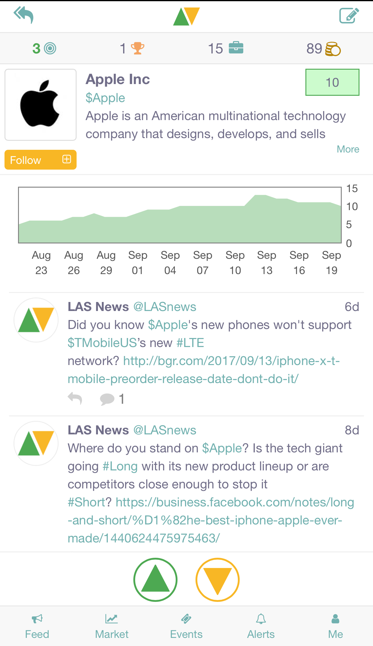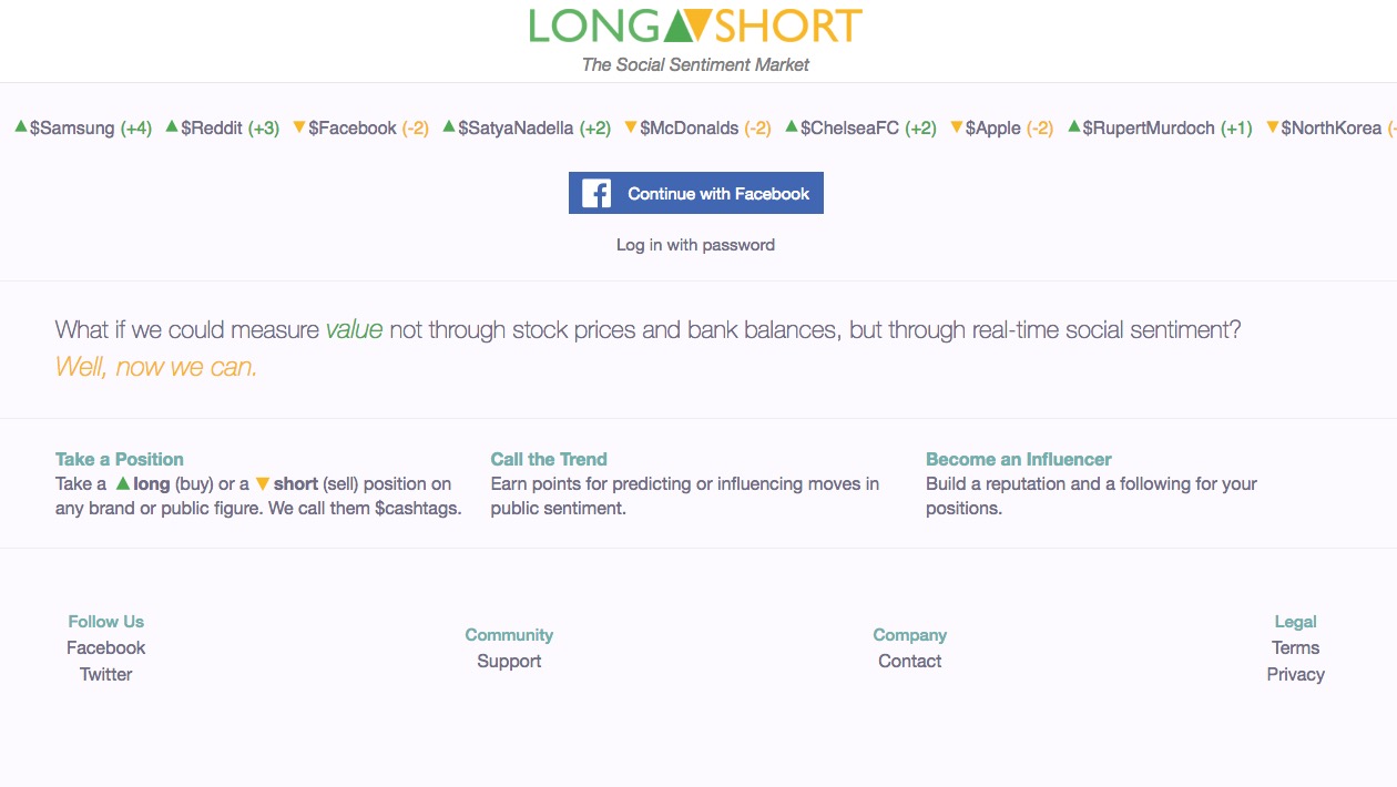 Long And Short is a game of predicting and influencing social sentiment on brands and public figures. We call them ‘$cashtags’. Brands $cashtags include anything from corporate brands and popular products to sports teams and movie titles. Public figures $cashtags feature actors, artists, athletes, business leaders, politicians, and other famous individuals. How Does It Work? Long And Short works like a stock market for sentiment, where players take long (?) or short (?) positions on the listed $cashtags, and earn points for predicting changes in social sentiment. A $cashtag’s social value is the sum of all long positions minus all short positions. If you have a long position on a $cashtag, you earn points when its value goes up and lose points when it goes down. If your position is short, you earn points when the value goes down and lose points when it goes up. You can track all your positions and points in your portfolio.