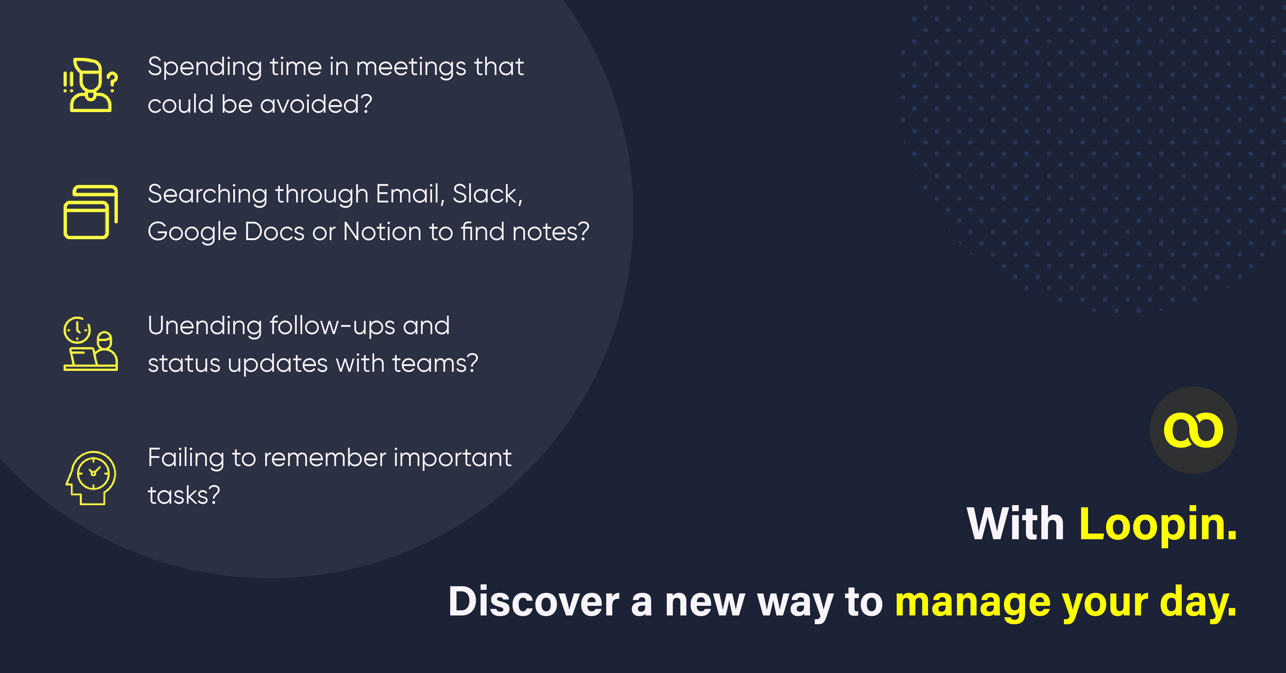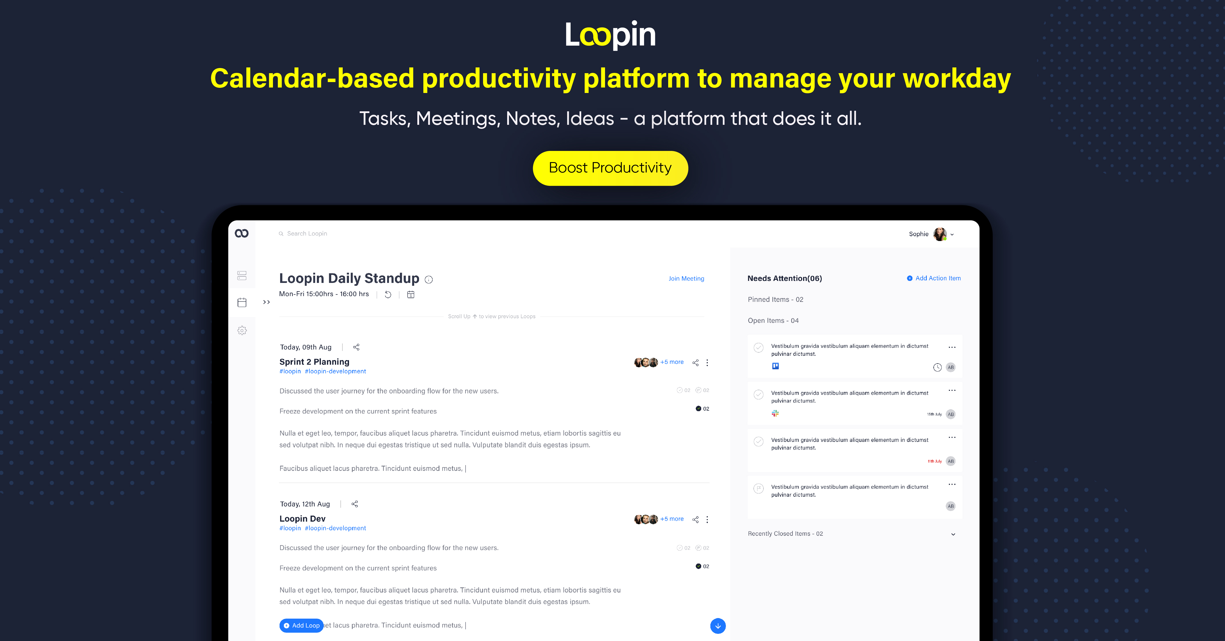 Loopin is the new age calendar – to plan and act through the day. Tasks, Meetings, Notes, Ideas – an intelligent calendar that does it all.? Calendars are outdated and do not support modern-day workflows. Loopin is here to fix that! ?? > Capture notes, tasks, ideas conveniently organized on a timeline > Notes connected to meetings. Recap notes to easily switch context in back-to-back meetings > Block time and track tasks straight from your calendar > Automate follow-ups and status updates > Integrates with popular work apps like Slack, Trello, Asana, Jira, and Notion.