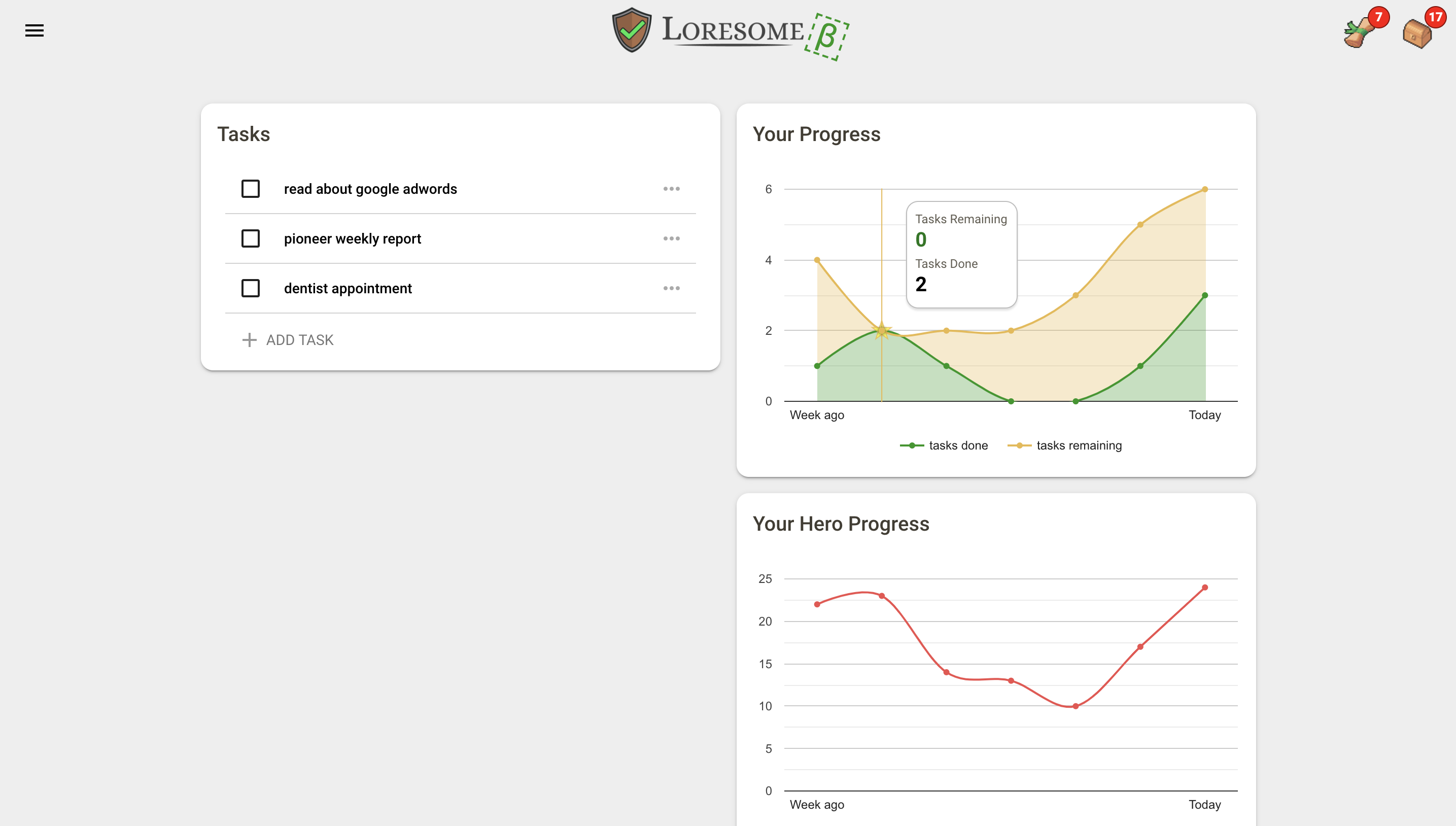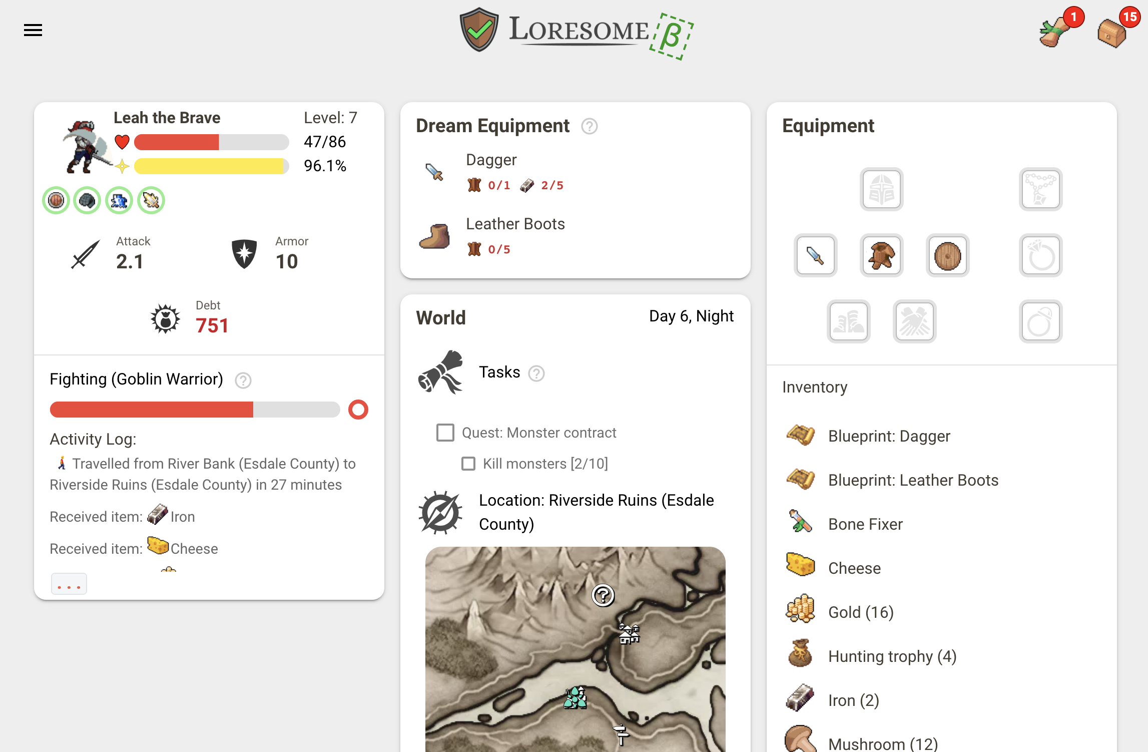 Loresome works like this: your avatar tries to live a life of adventure in a fantasy world, but it's hard! New armor for battles with dragons costs a pretty gold coin, and medical bills stack up too! But you can help her by doing tasks in your todo list, working out, and doing other good deeds. This will earn you various rewards: gold, healing potions, magical scrolls, quests, blueprints, and many other things. You can also connect other apps (such as todo lists or fitness trackers) and get rewards automagically every time you accomplish your goals!