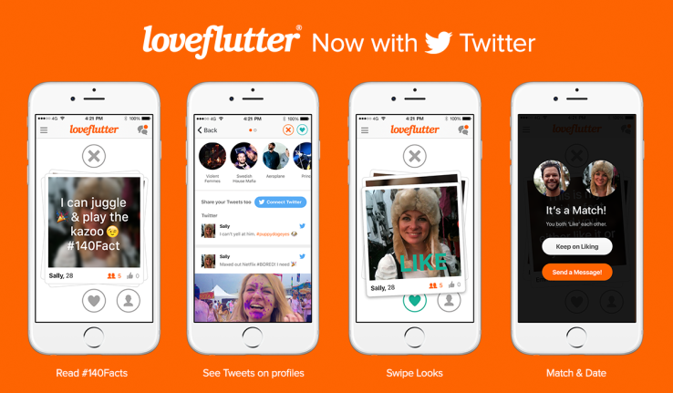 Welcome to All New Loveflutter with Twitter, rebuilt and redesigned to express your thoughts, feelings and opinions as well as looks. Bringing the power of 140 characters to dating. In addition to Facebook, you can now login with Twitter, add recent tweets to your profile & browse Twitter feeds of potential matches in-app. Because looks matter, but what you say counts.