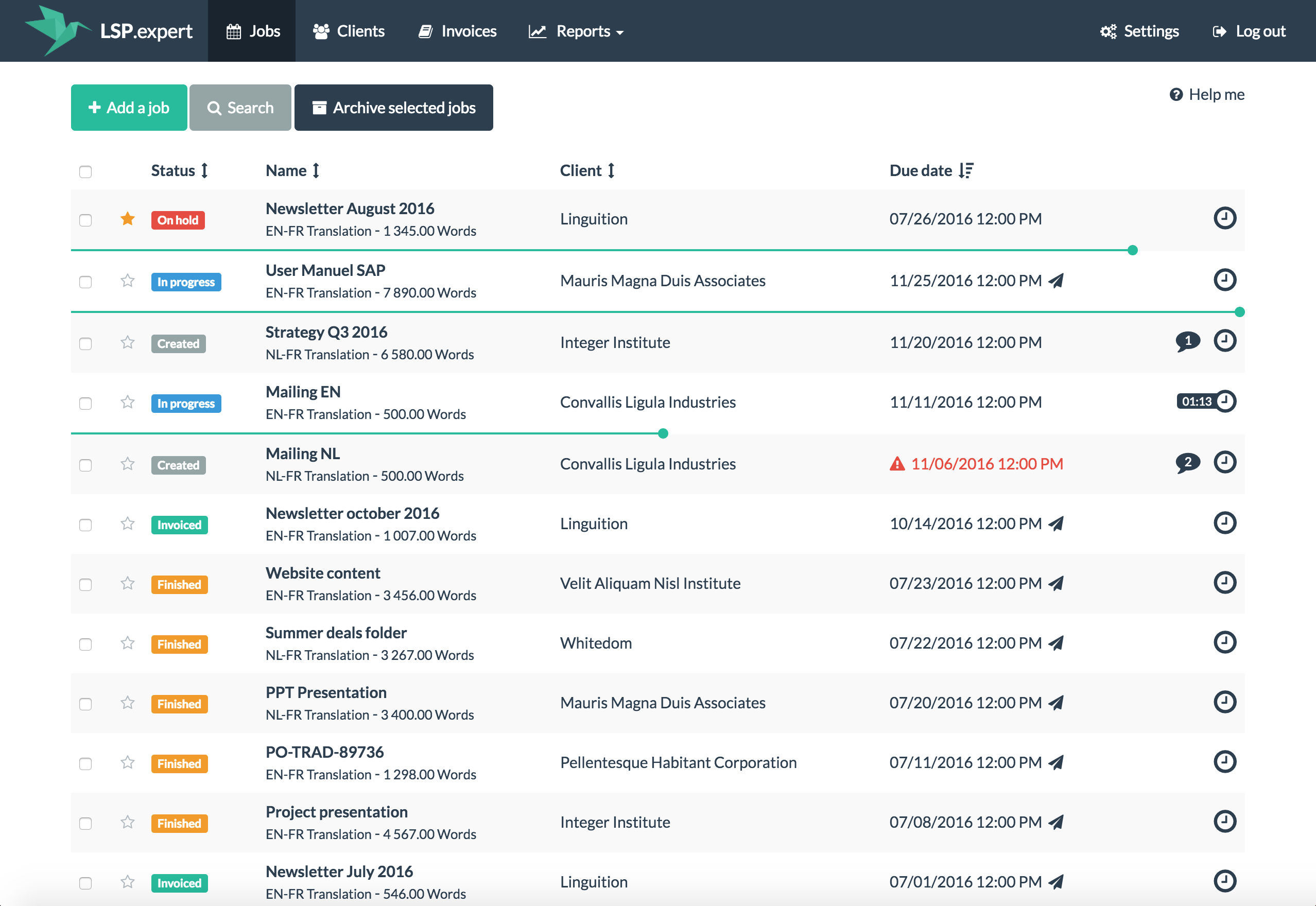 LSP.expert helps you manage your daily translation jobs. It’s easy, fast and secure. It is everything a freelance translator needs to get things done: - Track your daily work. Manage your priorities. - You can create invoices in just one click - You can also create quotes - Manage your clients: contacts, prices, etc. - You can generate interesting reports