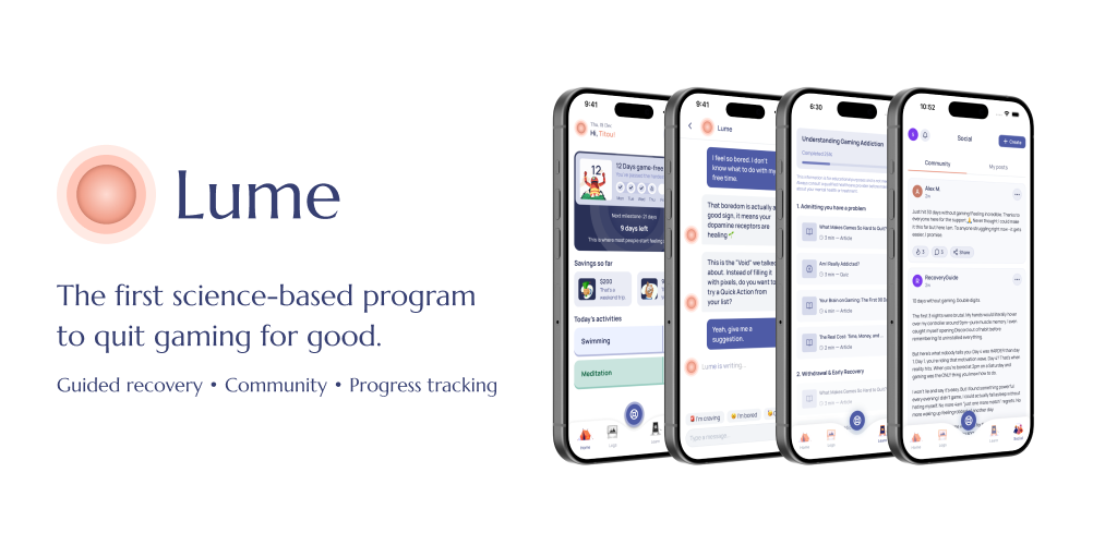 Lume is the first science-based mobile app dedicated to gaming addiction recovery. We help gamers who struggle with compulsive gaming behaviors regain control of their lives through evidence-based techniques, progress tracking, and community support. Key Features: • Personalized recovery program based on behavioral psychology • Daily check-ins and progress tracking • Science-backed strategies and techniques • Supportive community of people on the same journey • Gamification of recovery to keep you motivated Whether you're spending too much time gaming, neglecting responsibilities, or feeling like gaming controls your life, Lume provides the tools and support you need to build a healthier relationship with gaming.