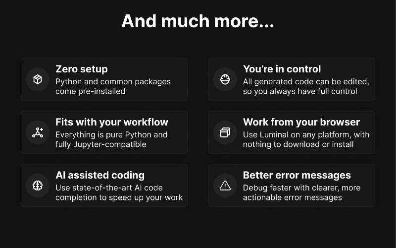 Luminal is the world's first AI-first Python notebook, letting you create scripts much faster and without needing to worry about the nitty-gritty. • Let Luminal's power cells and in-built code generation AI take care of the tedious, so you can focus on the interesting. • All generated code is editable, and the resulting notebook is fully Jupyter-compatible, so you always have full freedom and control. • Easily share and collaborate in real-time, Google Docs style. • No setup required — Python and common packages are pre-installed so you can get started right away. • Debug faster with clearer, more actionable error messages. • Luminal runs in your browser so there's nothing to download or install!