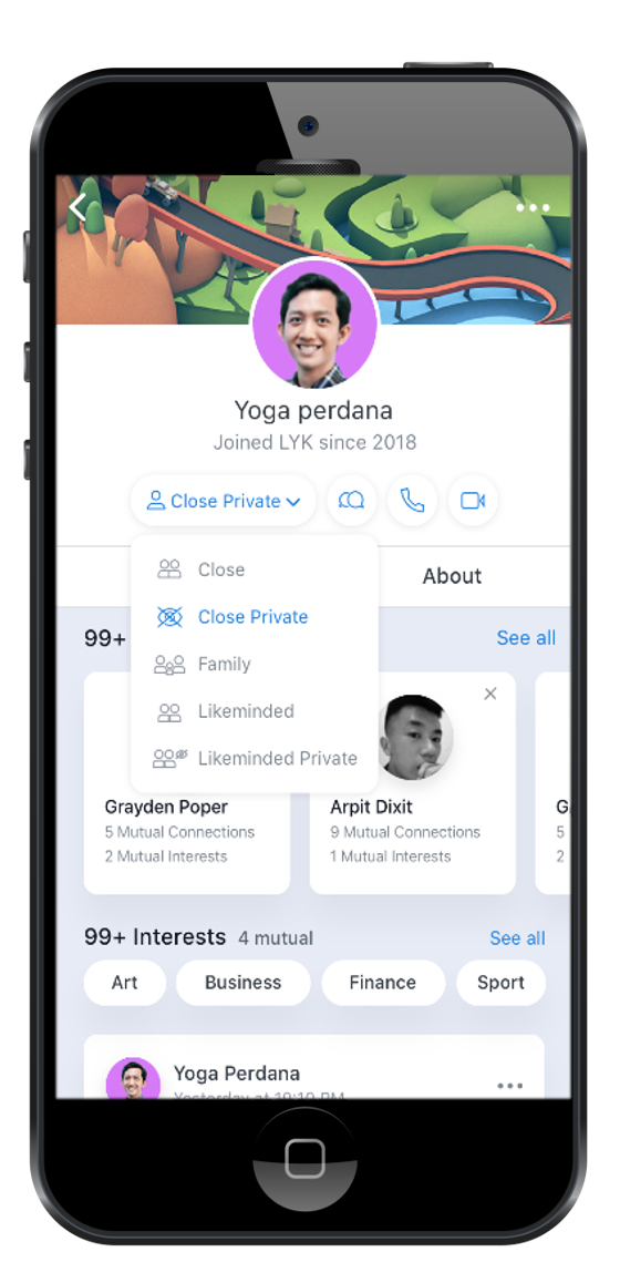 LYK is a social network for users to express, share & chat using privacy controls with Family, Close and LYK-minded connections. Users choose who they want to share their videos, posts, ideas and opinions with, while adjusting the scale of how much they want to be seen and heard. This mobile application allows you a new way of communication: take control of your posts, chats, comments, connections & more! Go as private or as public as you want on LYK. Shout out to the world or whisper to a selected few. LYK’s features include: -Choose your audience for every post -Define connections as Family, Close, or LYK-minded -Send disappearing messages -Make free unlimited calls -Comment privately over public posts or group chat conversations -Keep your connections invisible -Take full control over who sees your posts, group chats, live chats, photos or videos -Select your privacy filters based on your specific chat needs -Plan your next event inviting only who you really want