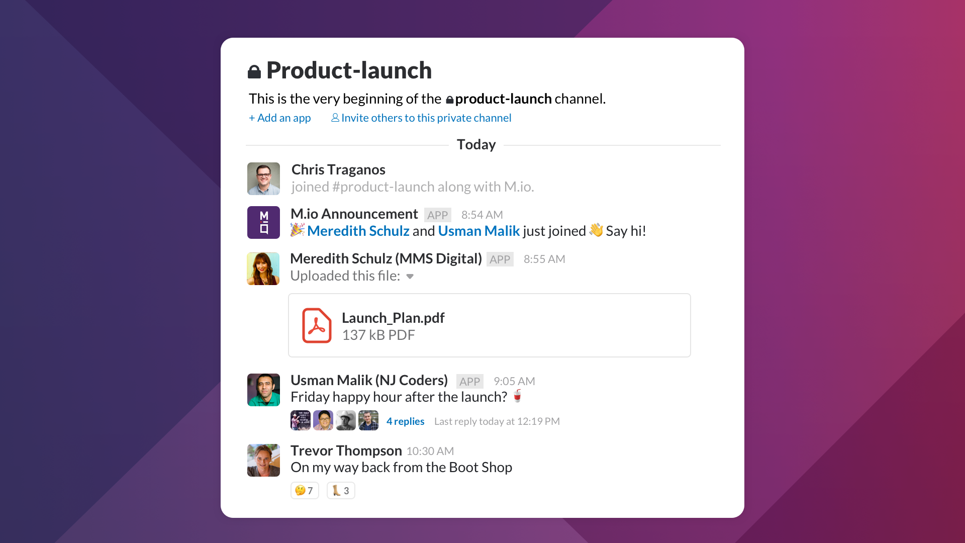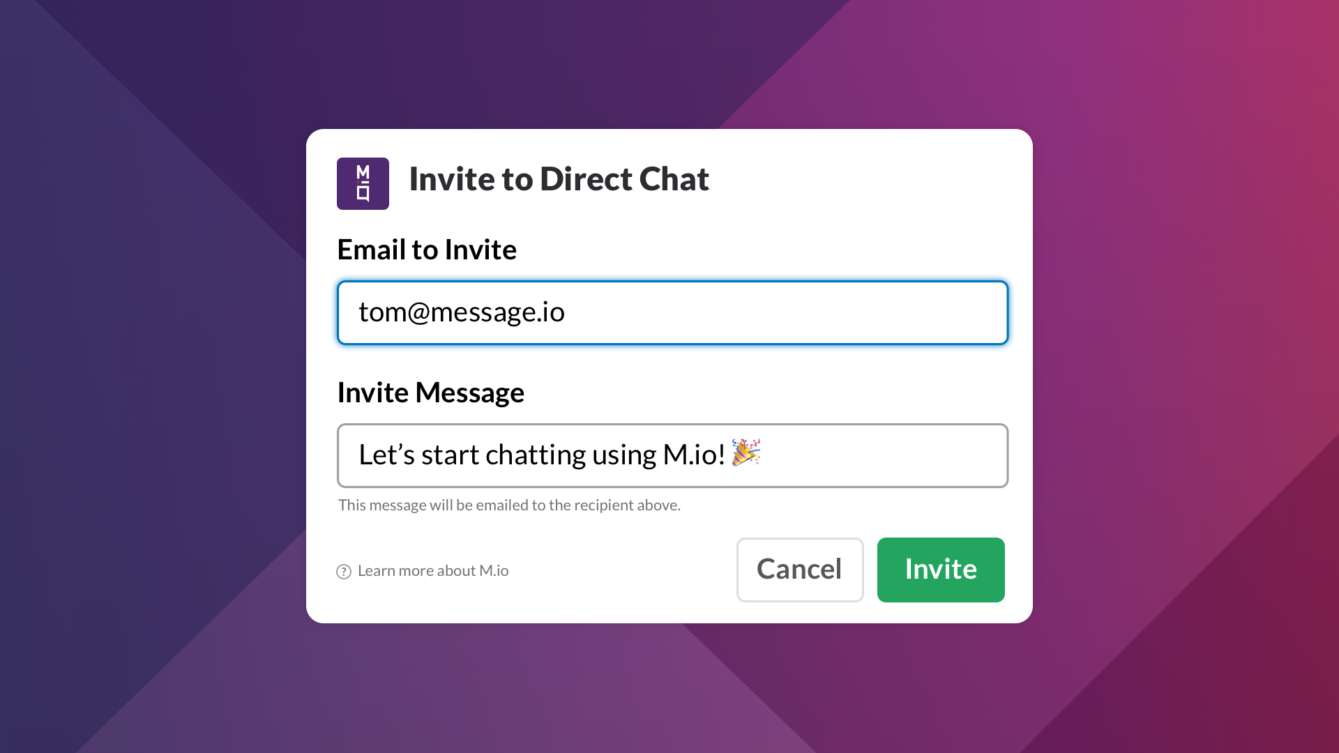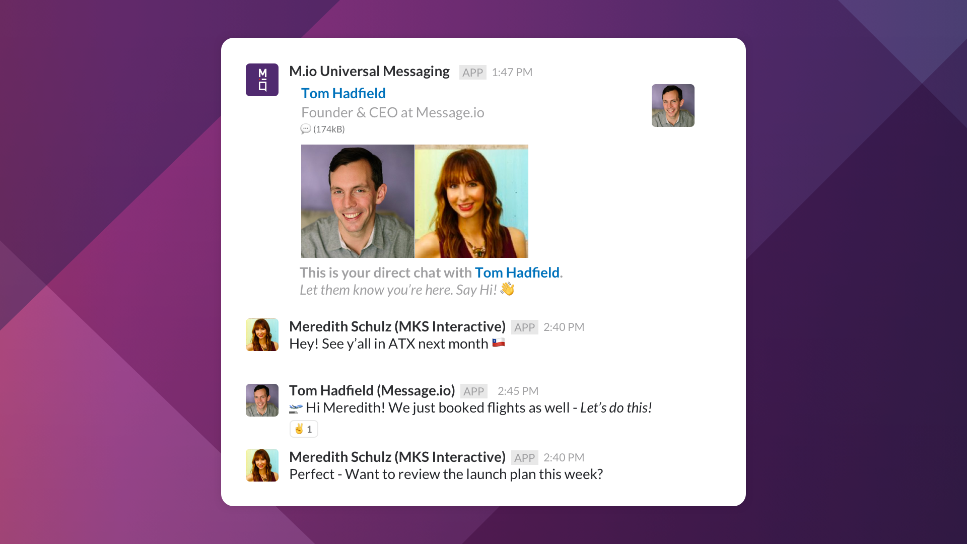 M.io is a universal messaging network. Users of popular chat apps like Slack, Cisco Spark, and Atlassian Stride can use M.io to send each other direct messages and join cross-platform channels. M.io is the easiest way to chat with external vendors, partners and customers regardless of which chat app they use.