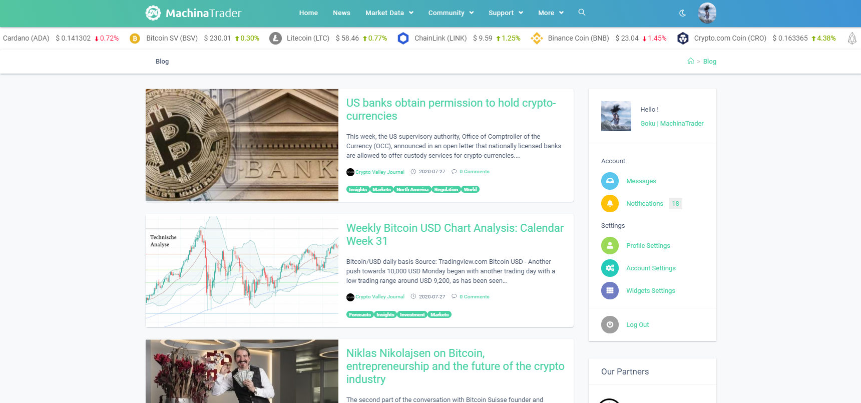 MachinaTrader is a Swiss-based trading platform that offers its users a complete set of tools for algorithmic and manual trading, including a social network and marketplace. Our subscriptions will range from $19.90 to $249.90 per month. More products with dynamic pricing such as trading strategies, tutorials, extended reports and datasets will be provided via our marketplace by our community or by us to enable our user-base to the best of our abilities. The current focus is on trading crypto assets, with the potential to expand our offering to the traditional and commodities markets. MachinaTrader is the Swiss Army knife for automated trading, which sets a new standard for developing, testing and executing trading strategies in one single place and provides: -Professional tools for high-performance trading, backtesting, analytics and integrated concepts of machine learning -One single cockpit to monitor, manage and trade digital assets -Self-enabled community and strategy rental through own social network network and open source strategy