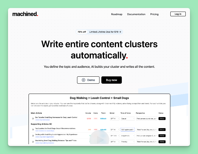 Machined can power your entire blog. Simply define your topic and audience, and our robots will conduct all your keyword research, construct interlinked content clusters and write all the articles in bulk. No SEO experience required - it all happens in the background, in minutes. Publish directly to Wordpress. Supports 100+ languages! Bring your own API key.