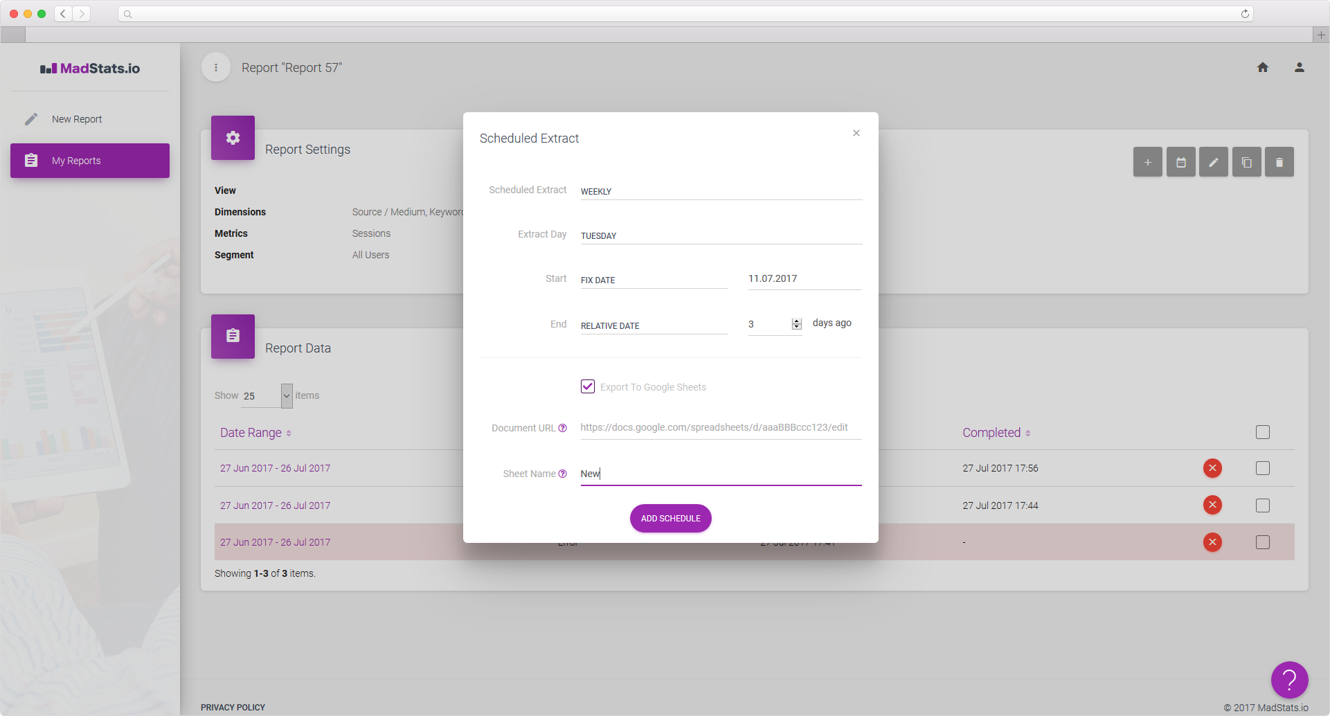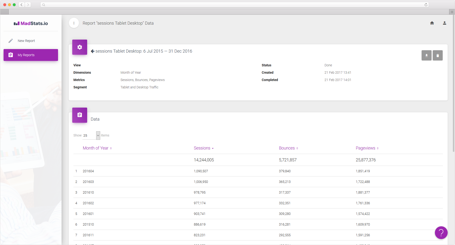 Sampling in Google Analytics occurs when the number of visits in the report date range exceeds a certain limit. It can dramatically reduce the accuracy of data, leading to wrong conclusions and decisions. MadStats.io solves this problem by allowing you to get reports without sampling. Service breaks you report query into multiple queries with smaller date range so that each individual query does not trigger sampling. Data for each period is extracted using Google Analytics Core Reporting API, and then aggregated again.