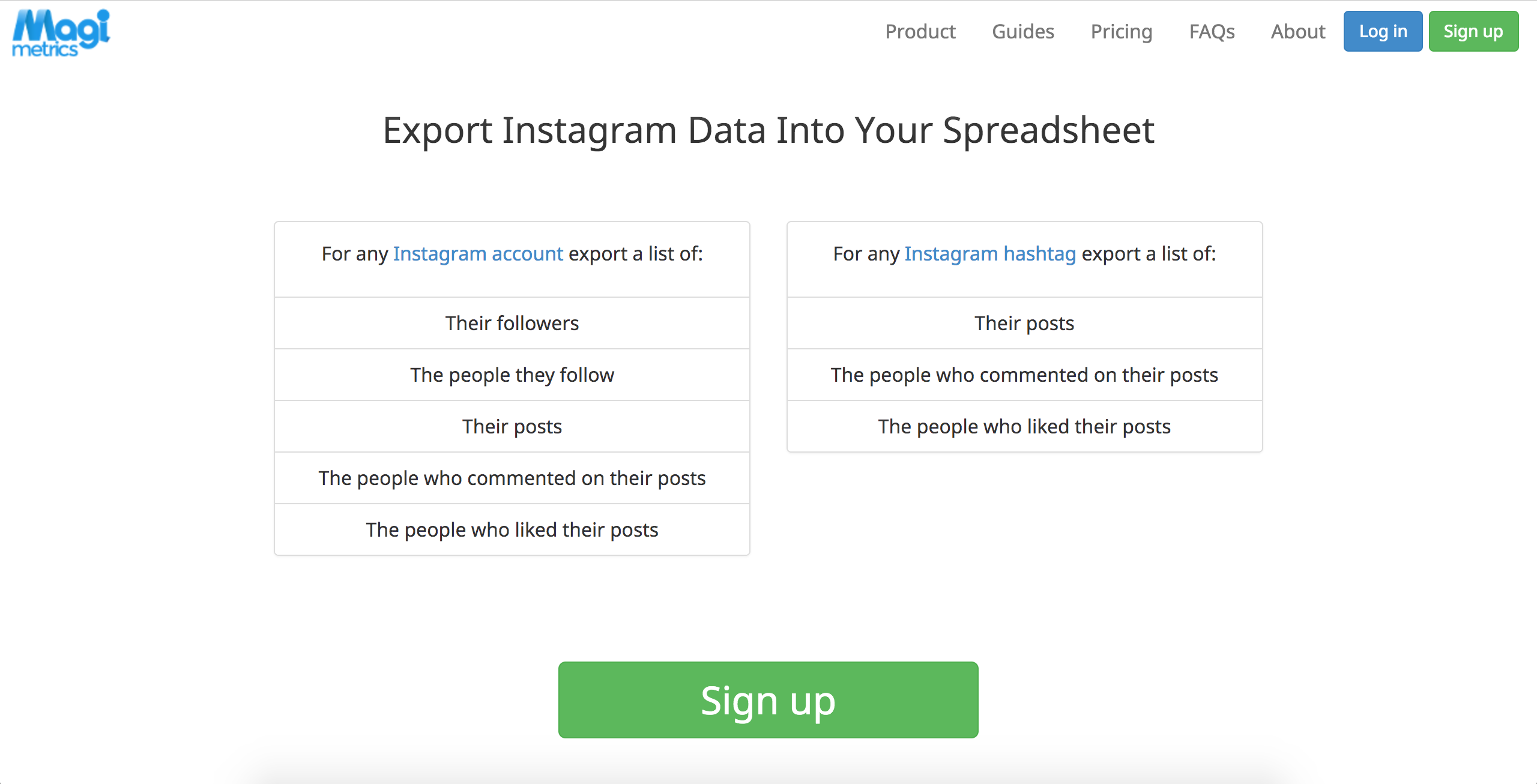 Export data from Instagram into your spreadsheet. Export the followers, follows, posts, likes or comments of any Instagram account. Export the posts of any Instagram hashtag. Export the posts from any geographic location. Try the free trial: www.magimetrics.com