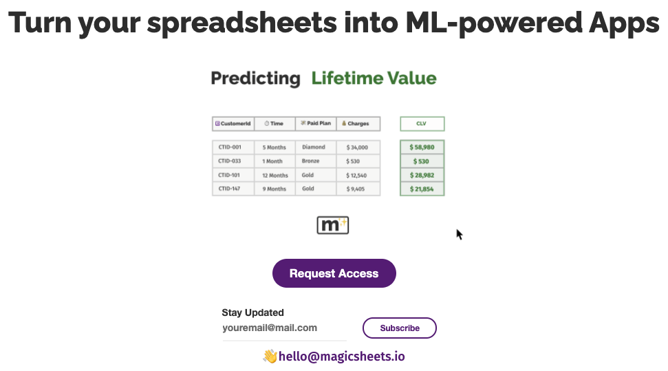 ? Unlock the full potential of your data with our no-code spreadsheet tool! Magicsheets can help you make data-driven business decisions using Machine Learning, without having to write a single line of code! ? ? We are actively looking for beta-users ? ? Reach out to us for a demo and more information about how we can help you leverage your data. www.magicsheets.io