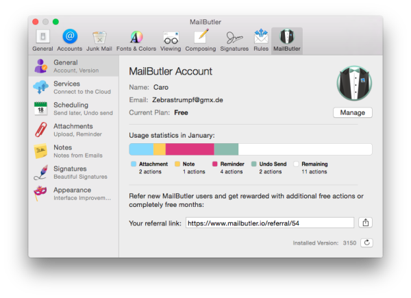 Mailbutler is your personal assistant for efficient and productive work with emails. It adds a wide range of features to Apple Mail and Gmail while working in their native interface: • Send Later: Write emails now, send them later • Email Tracking: See what happens to your emails after they are sent • Cloud Upload: Upload email attachments to the cloud to keep your messages feather-light • Undo Send: Retract messages after having pressed "Send" • Emails to Notes: Easily create notes (e.g. in Evernote) from your emails • Attachment Reminder: Never forget to attach files to your emails again • Signatures: Appear more professional by using a beautiful email signature And more!