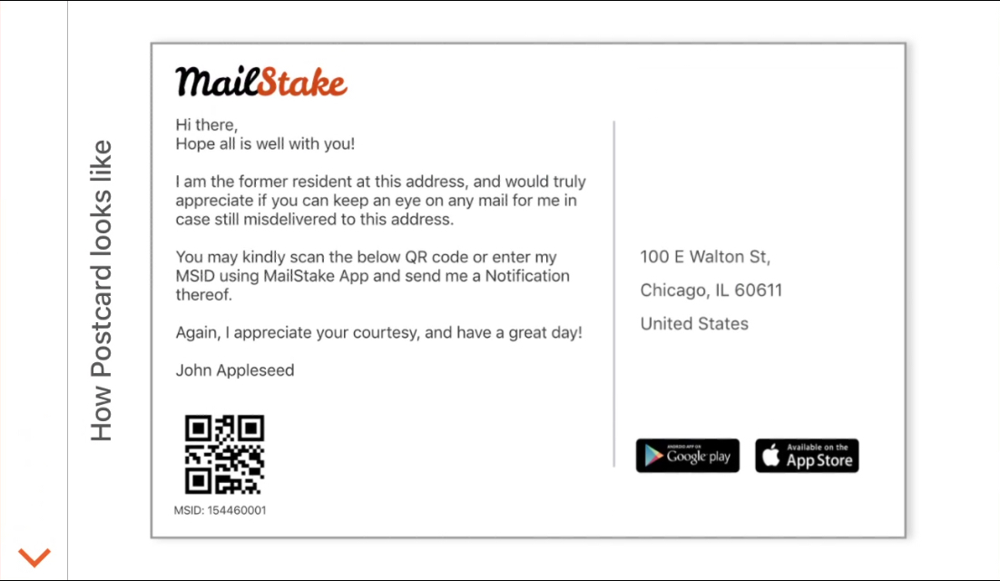 MailStake is a social network that allows users to manage and connect with their former addresses to be notified about any misdelivered mail. The platform also allows users to chat with one another and purchase self-addressed envelopes to recover their misdelivered mail, safely and securely.
