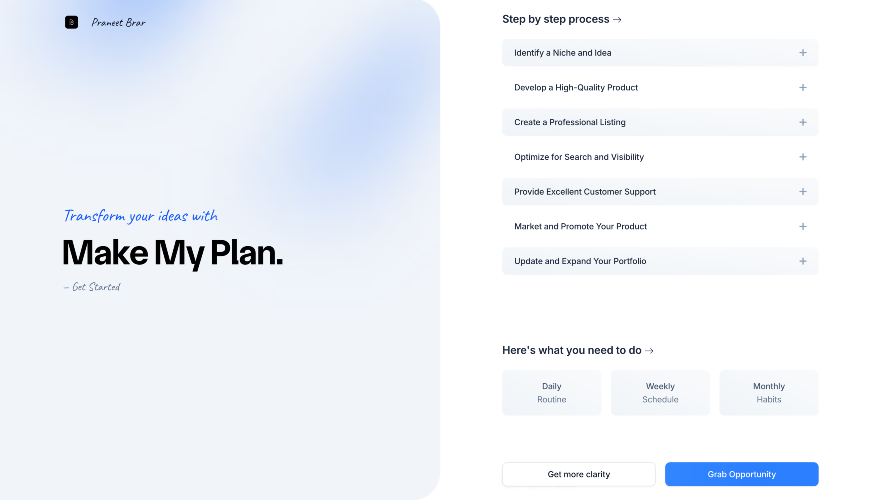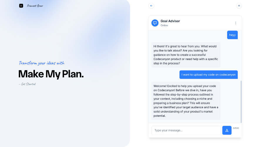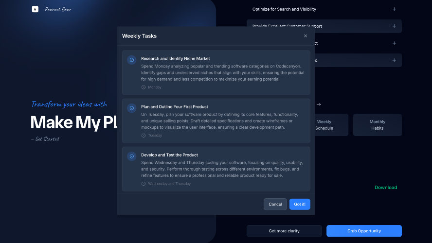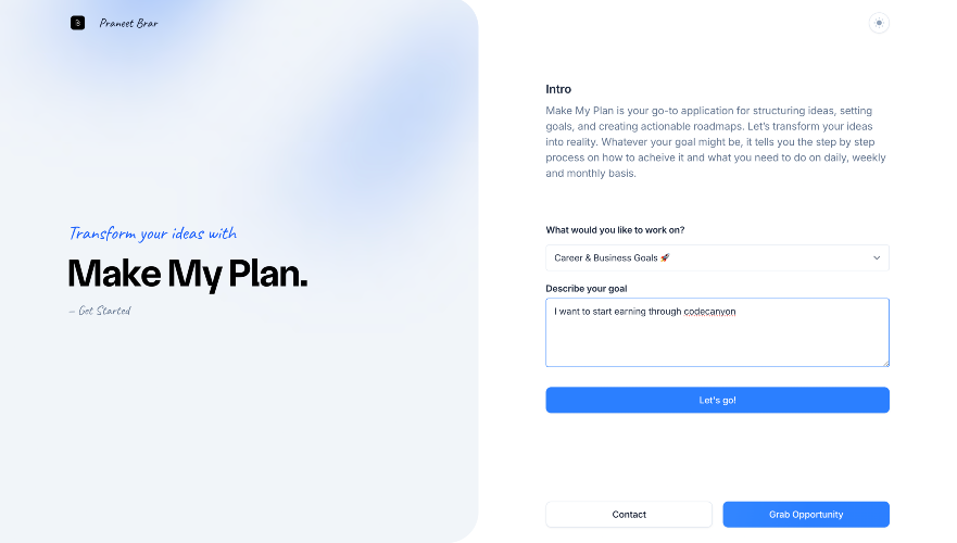 Make My Plan is an AI-driven goal planner designed to help you turn your aspirations into reality. Whether you're working towards personal growth, career milestones, or any other goal, this intuitive platform guides you step by step, ensuring you stay on track and motivated every day. With Make My Plan, your goals are broken down into manageable tasks and organized into daily, weekly, and monthly plans. The app’s personalized AI Goal Advisor offers tailored advice and guidance, keeping you focused and on the right path. Need help along the way? You can chat with the AI Goal Advisor in real-time for expert advice, ensuring you're always making the best decisions to achieve your goals. In addition to seamless task management, Make My Plan offers a responsive design, ensuring you can access your plans anytime, anywhere on both desktop and mobile devices. The app also allows you to download and export your personalized plans as text files, providing an easy way to track your progress offline. Customize your experience by switching between dark and light modes to suit your preferences. Make My Plan is not just a tool, it’s a partner in your journey towards success, giving you the clarity, support, and structure you need to achieve your goals.