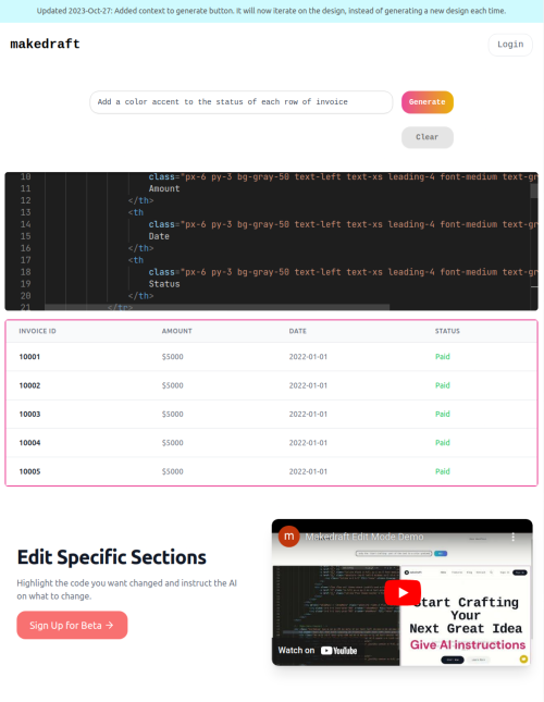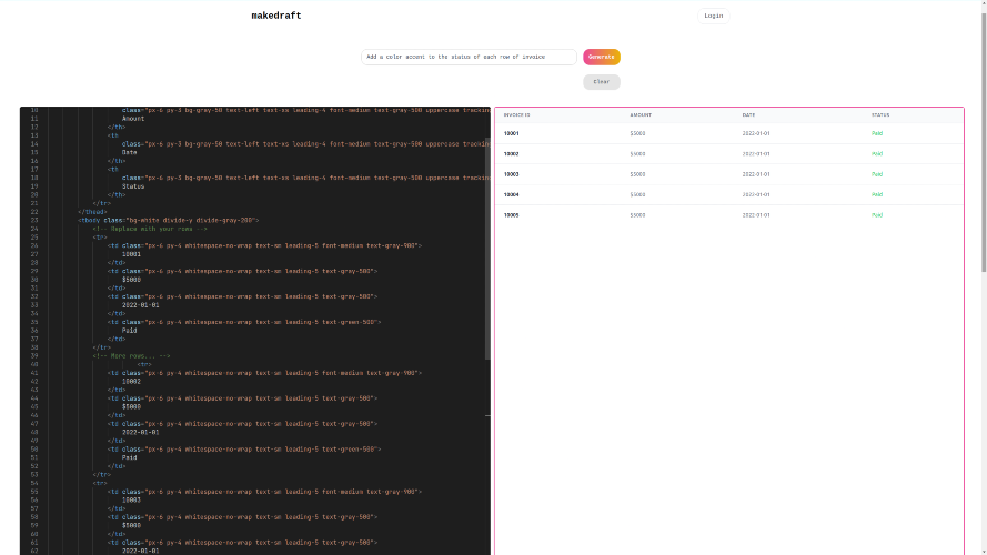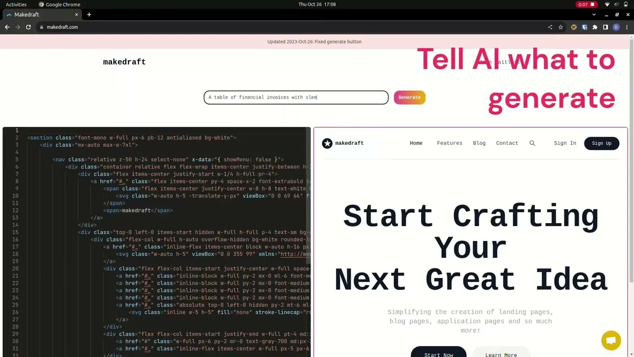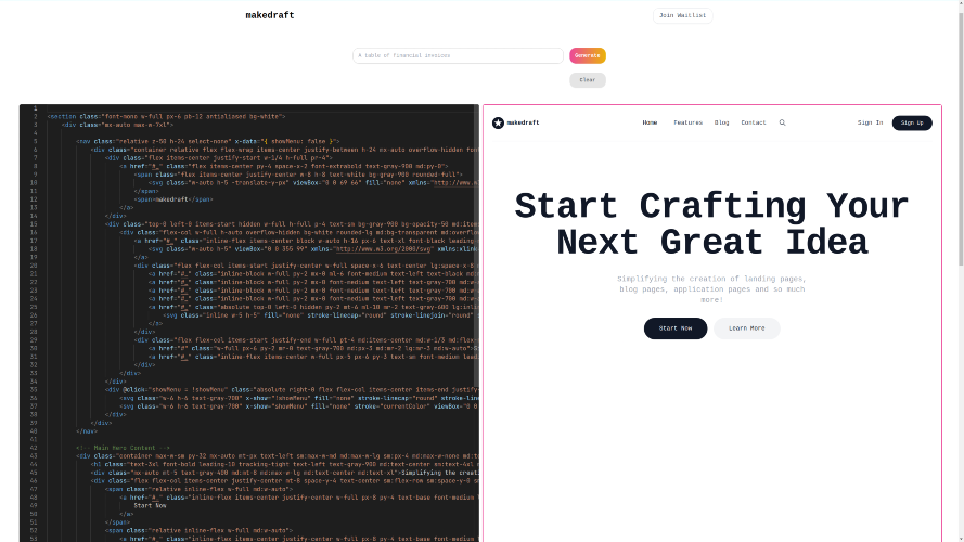 Makedraft helps developers ship fast by generating HTML templates with AI. Makedraft is the v0.dev alternative for people who want plain HTML and TailwindCSS. Get started free! 💡Who's it for? 1. Frontend developers who want to rapidly prototype frontend templates. 2. For backend developers to quickly ship a frontend with familiar tooling. 3. For non-developers to create HTML without code. 🙋How's it different from v0.dev? 1. No need for React or Next.js ❌ v0.dev: Locked into React and Next.js ✅ Makedraft: Creates plain HTML and CSS. So it works anywhere! Vue.js, HTMX, Alpine.js, Angular, Jinja2 etc. 2. No need for shadcn/ui ❌ v0.dev: Locked into shadcn/ui, which also depends on Radix UI ✅ Makedraft: Only uses TailwindCSS!
