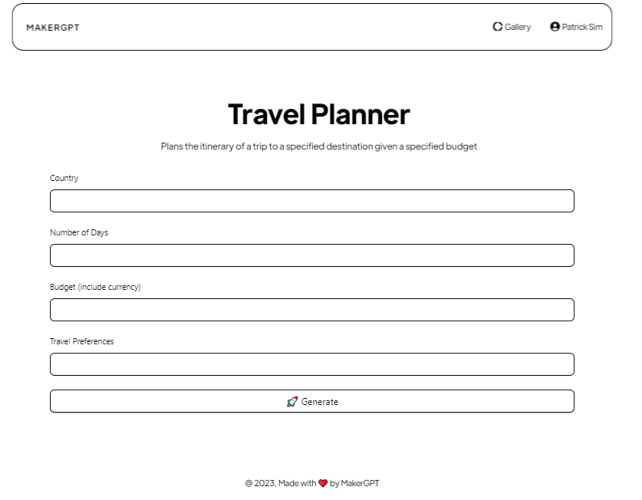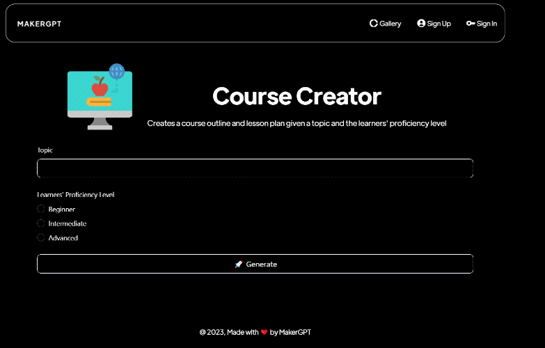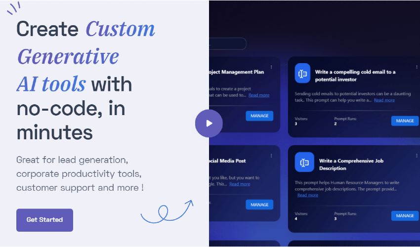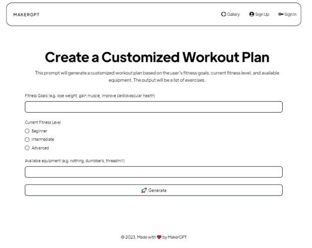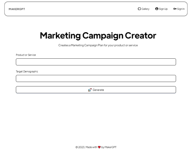 MakerGPT allows anyone to easily create Custom Generative AI Tools with no code, in-minutes. (1) Train the model with your custom knowledge (documents, website, or prompt) (2) Configure the User Interface (chat or form) and (3) Publish the link or Embed the tool. MakerGPT is great for corporates looking to manage their Generative AI deployment or for small businesses looking to make a Generative AI tool for lead generation.