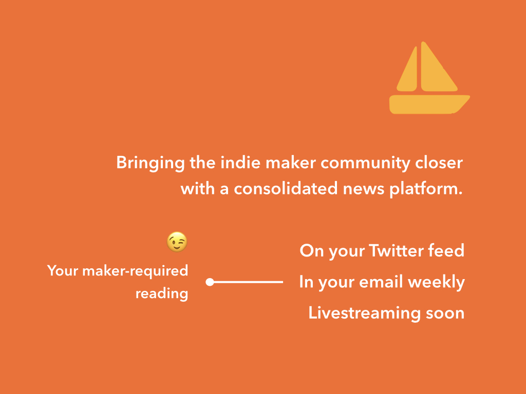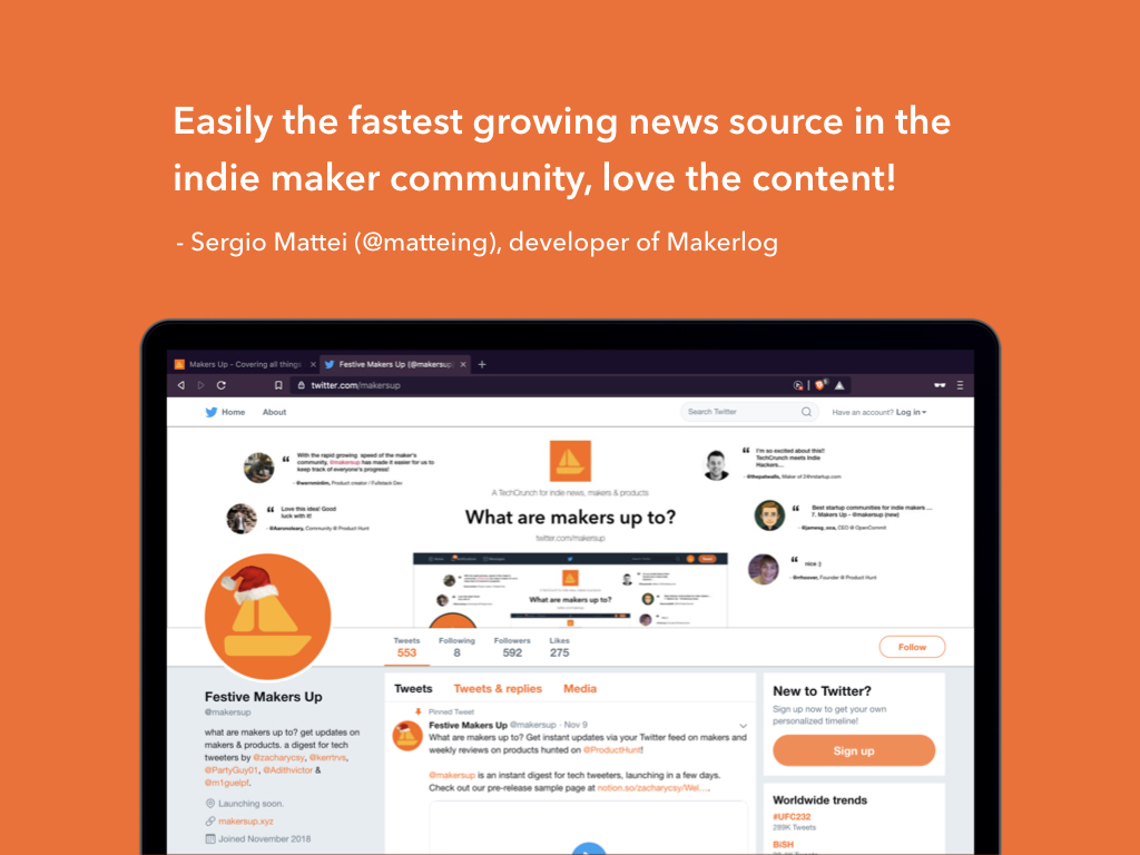 ? Makers Up was created just a bit over a month ago when I tweeted one GIF on a new Twitter account that said, “What are makers up to?”. Surprisingly enough, it attracted enough attention for me to go in-depth on why it did. In the past year or so, the indie makers community has been growing. There are boards like IndieHackers, Makerlog, and groups like WIP.chat, Maker’s Kitchen, but there isn’t a single news source out there. ? Today, we’re finally launching Makers Up to everyone as the first news source for the indie maker community. News is currently sent via Twitter and email, but soon, we'll be live-streaming on Twitch.tv too! Don't have Twitter, no worries - join us on Telegram for even longer-than-280-character live updates of just about everything! ? We’d love to get some feedback on how we’ve been doing, and we hope you would find Makers Up useful. We’re happy to answer some questions too!