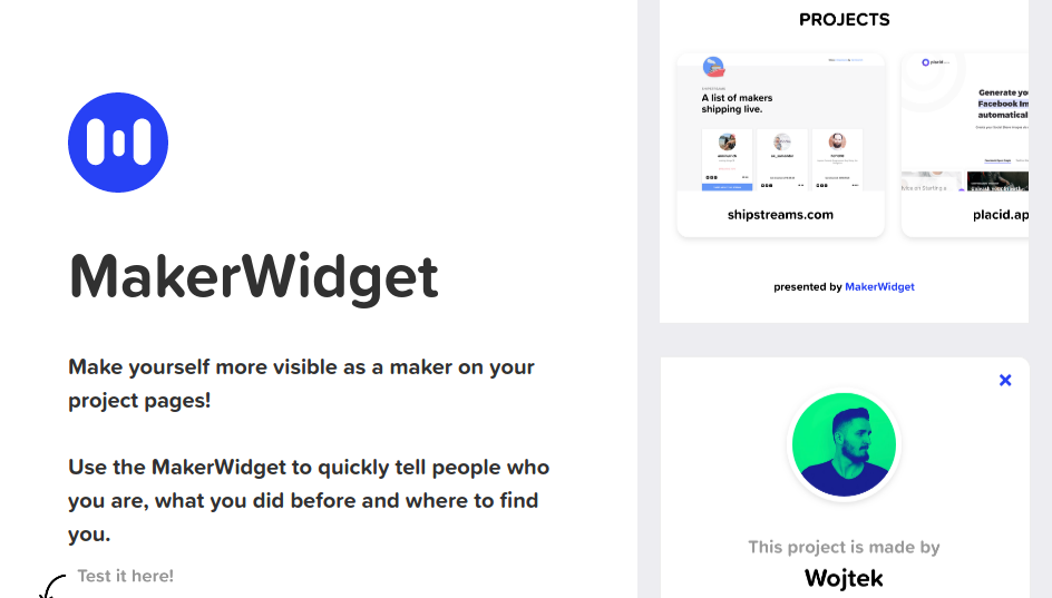 Use the MakerWidget to quickly tell people who you are, what you did before and where to find you. - Free forever - Go PRO for 5$ to forever remove the MakerWidget Link - Sign-Ups via E-Mail Magic Links