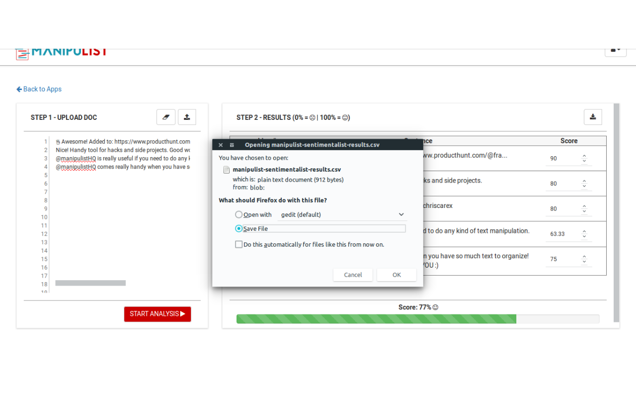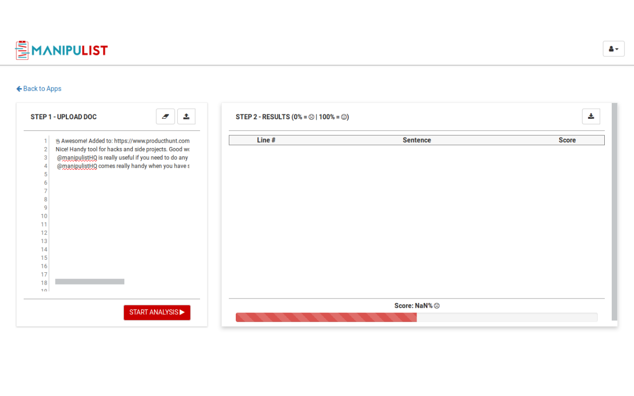 Manipulist Sentimentalist makes sentiment analysis easy and intuitive for anyone. Simply type or upload a text file and run the analysis. ML Sentimentalist will give you a result for each sentence found and provide you an overall score highlighted by a colorbar. Not only that! You can change the results on each lines and you can export the results in a spreadsheet-friendly csv format for further analysis. You can also add the Manipulist Sentiment badge to your website to prove the sentiment over your product or website. Do you need a quick sentiment analysis of your website reviews? Manipulist Sentimentalist is the tool you need! Do you want to know the popular sentiment over a topic based on recent tweets? Manipulist Sentimentalist is the tool you need! Do you want an additional external badge to certify your website reviews' sentiment? Manipulist Sentimentalist is the tool you need!