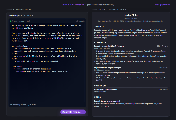 manyresumes creates ATS-optimized, job-specific resumes in seconds. Build your experience profile once, paste any job description, and instantly generate a resume tailored to that role. AI adapts wording, structure, and formatting so your resume passes screening software and reads naturally to recruiters, without prompts, templates, or constant rewrites.