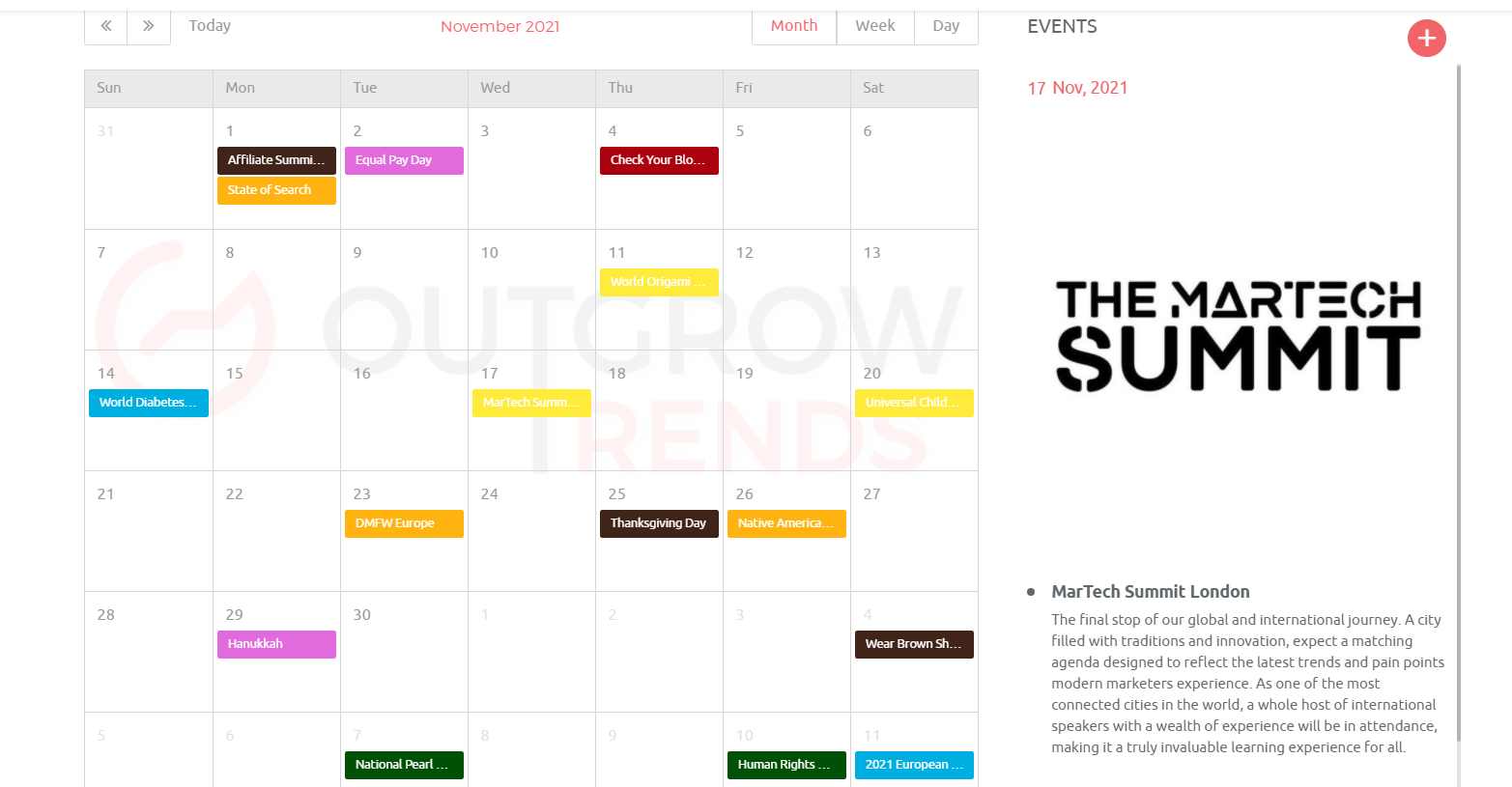 Outgrow's Marketing Trends Calendar is a marketing and tech calendar with the latest events and conferences. It has fun and important dates like "pie day", "Star Wars day", Kentucky derby, Black history month, etc. With a curated list of events, you can add fun and games to your email and social media campaigns and engage with your audience. Every event has an interactive experience attached to it, like a quiz, assessment, calculator that you can share with your community. Or you can also get inspired by these quizzes and create polls on your Instagram stories, Twitter, and LinkedIn. You can also add these events to your calendar by simply clicking on an event. Stay ahead of your competitors and use Outgrow's Marketing trends Calendar today!