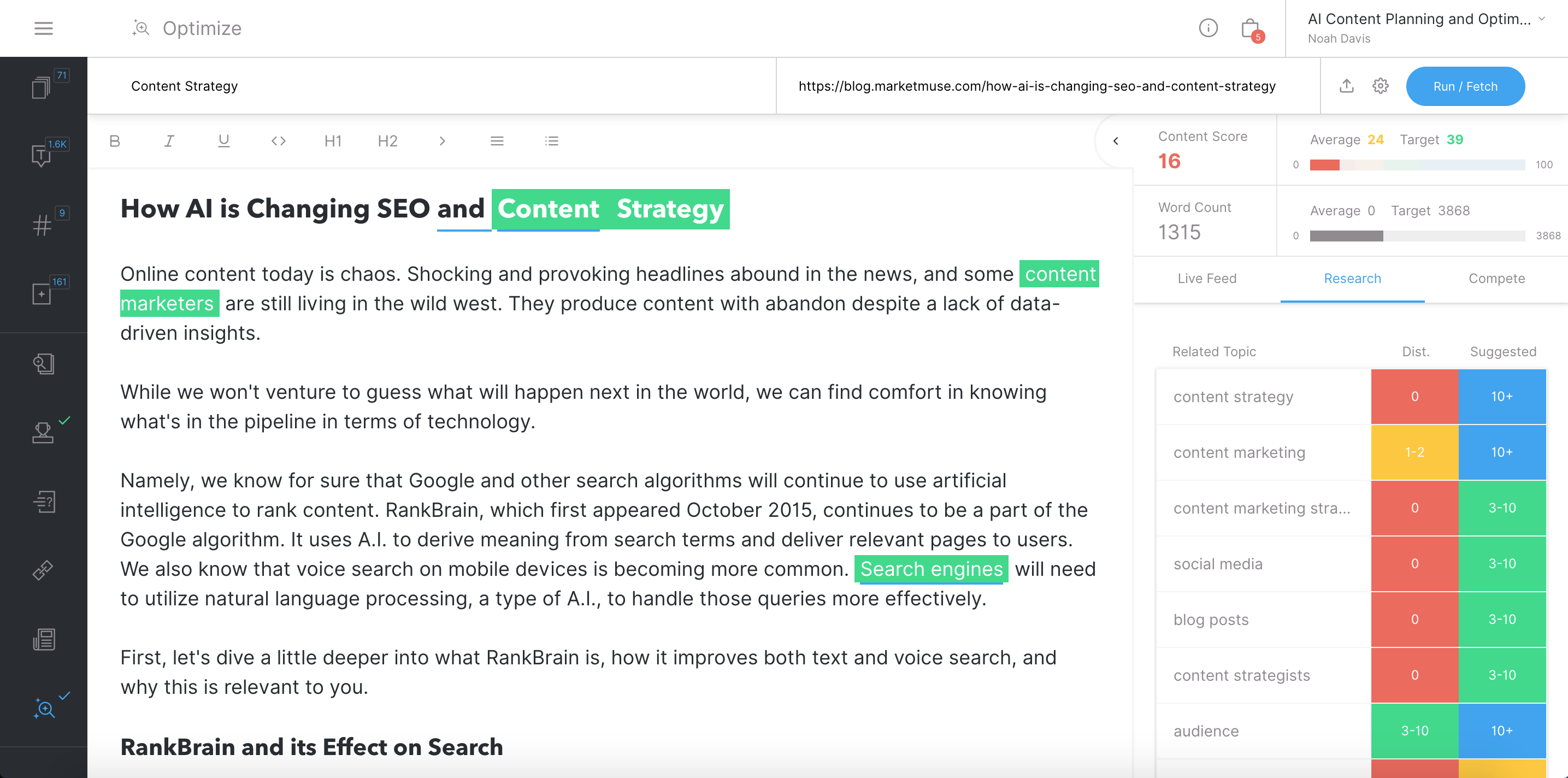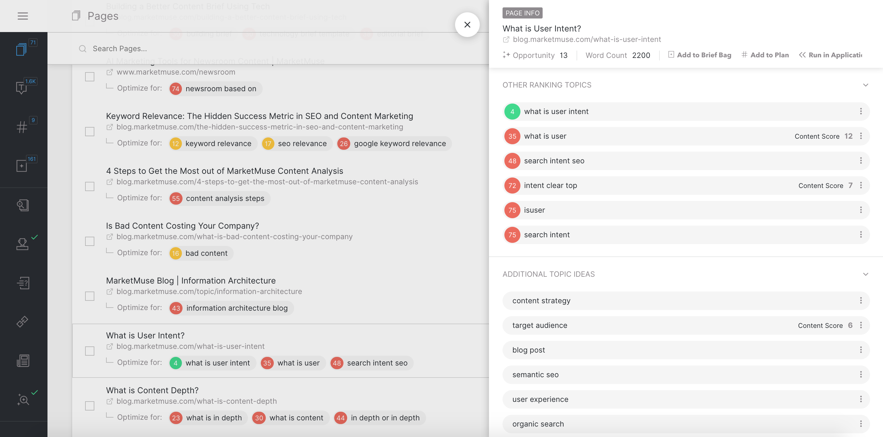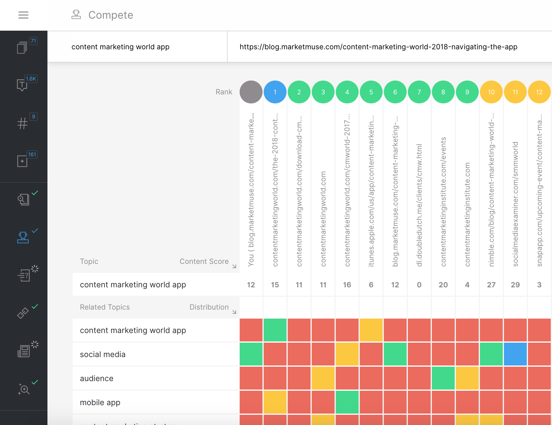 How MarketMuse Helps You Outrank Competition 1) Optimize your existing content to rank higher for more keywords and improve audience engagement. 2) Find gaps and opportunities for new content creation prioritized according to their probable impact. 3) Write high quality content faster. Optimize live with our built-in editor, showing how in-depth your topic is covered and what needs improvement. 4) Streamline your content workflow. Modernize your research, writing and editorial processes. Give your content team the exact tools they need to create A+ content substantially faster.