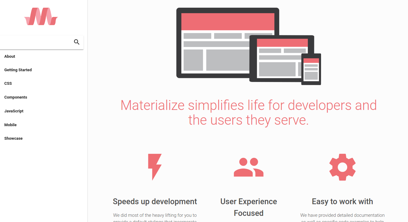 Materialize comes in two different forms. You can select which version you want depending on your preference and expertise.To start using Materialize, download one of the options below - 1. Materialize This is the standard version that comes with both the minified and unminified CSS and JavaScript files. This option requires little to no setup. 2. Sass This version contains the source SCSS files. By choosing this version you have more control over which components to include. You will need a Sass compiler if you choose this option. Materialize Features - - Speeds up development - User Experience Focused - Easy to work with Material Design’s Principles - - Material is the metaphor - Bold, graphic, intentional - Motion provides meaning