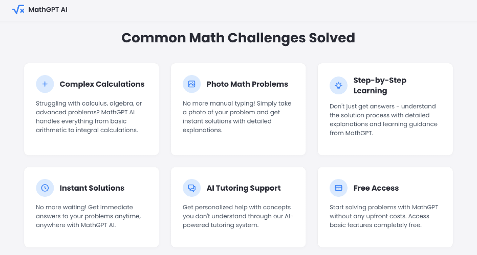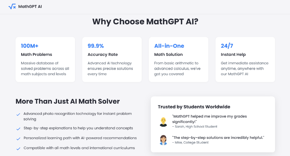 MathGPT is an advanced artificial intelligence platform specifically designed to tackle complex mathematical problems. Our cutting-edge solution provides step-by-step guidance and detailed explanations for a wide range of mathematical challenges, from basic arithmetic to advanced calculus and beyond. Key Features: - Comprehensive Problem-Solving: Get detailed solutions with clear explanations for every step - Multiple Math Domains: Support for algebra, geometry, calculus, statistics, and more - Educational Focus: Learn not just the answer, but understand the underlying concepts - User-Friendly Interface: Simply input your math problem and receive instant, accurate solutions - Versatile Input Methods: Support for text, equations, and mathematical notation Perfect For: - Students seeking homework help and exam preparation - Teachers looking for teaching aids and problem examples - Professionals needing quick mathematical verification - Anyone wanting to improve their mathematical understanding Our AI engine combines advanced mathematical knowledge with natural language processing to break down complex problems into understandable components. Whether you're struggling with quadratic equations, integral calculus, or statistical analysis, MathGPT provides clear, accurate, and educational solutions. Get started now for free: https://math-gpt.ai
