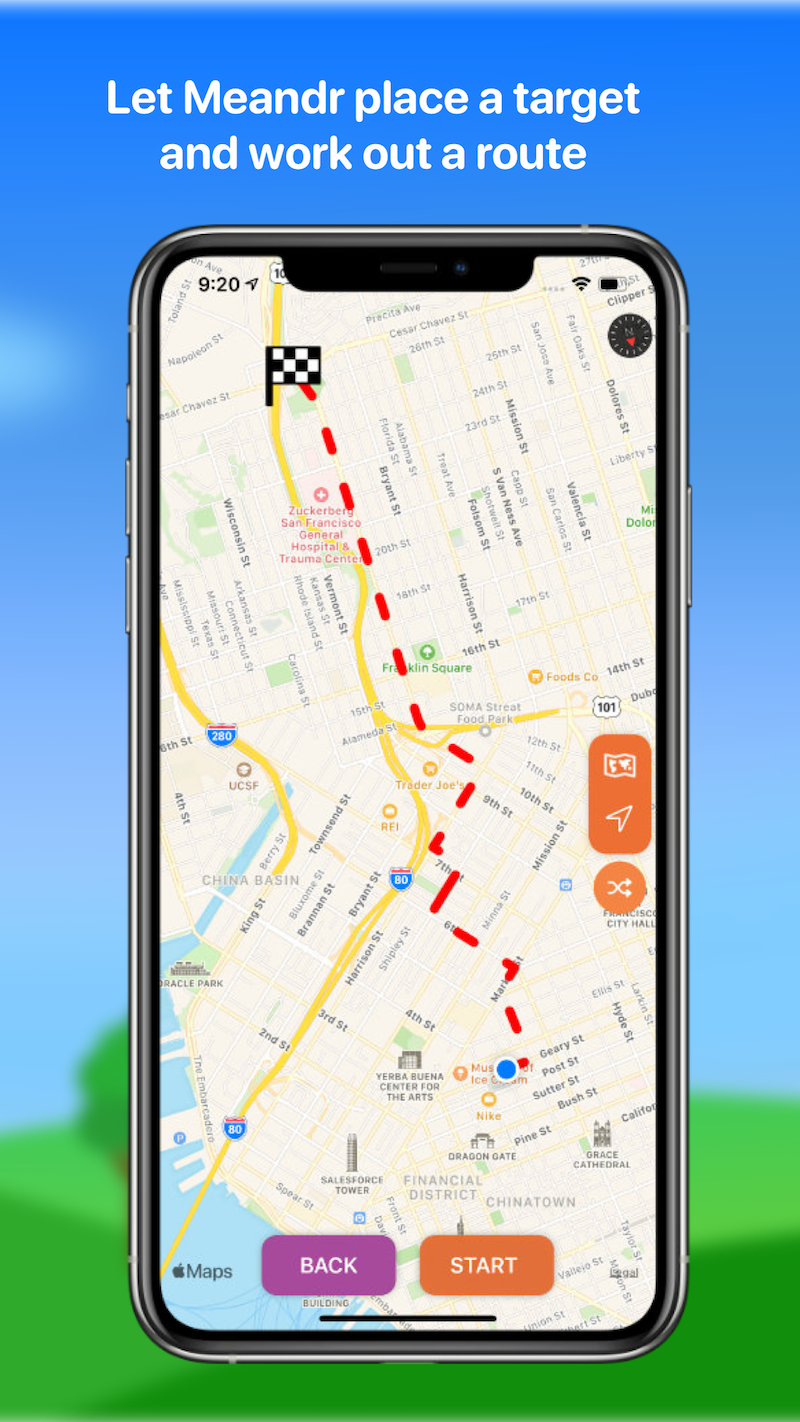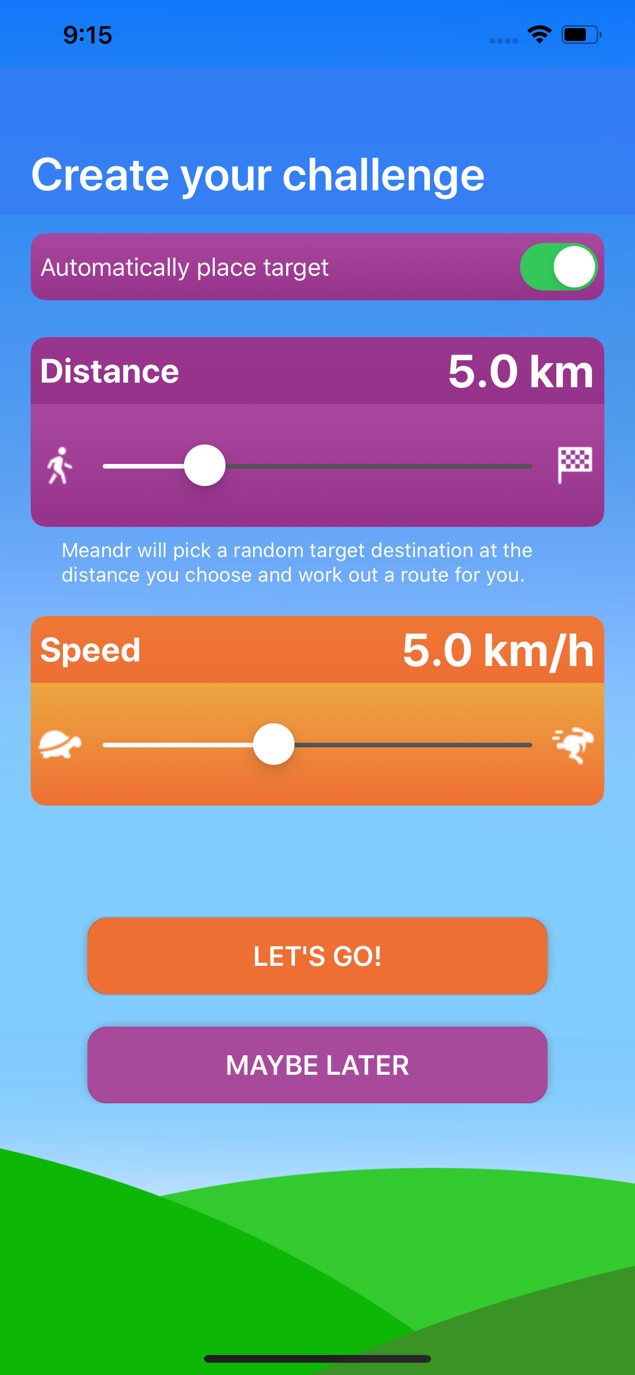 Choose how far you want to go and how fast. Meandr will work out a route for you to complete and then time how long it takes. You can also choose your own target by tapping on the map and Meandr will work out a route to get you there. Try and complete each route in time, or just relax and Meandr at your own pace! The history of each challenge is stored so you can re-do one at any time. No pressure - choose a distance and pace that suits you. Simple, fun interface designed to get you going in three taps. Tracks the distance, time and number of steps for each challenge. If you didn't finish a challenge, just find it in the history and replay it. Unit of measurement can be set to kilometres or miles. One time purchase, no subscription.