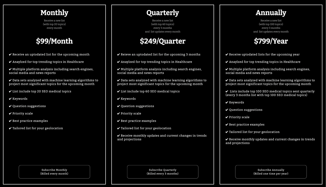 We analyze several parameters like search analytics, social media, and news reports to come up with the most trending topics in healthcare. Then we analyze the lists using machine learning to predict the priority of the topics in our lists for search engine optimization and how significant the data set is for the upcoming months. We then add keywords, questions, related topics, and links for best practice and research. This way the list includes everything our customers need to start creating great SEO medical content and publishing it.