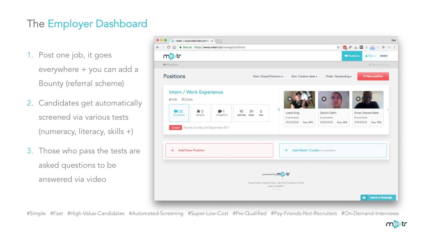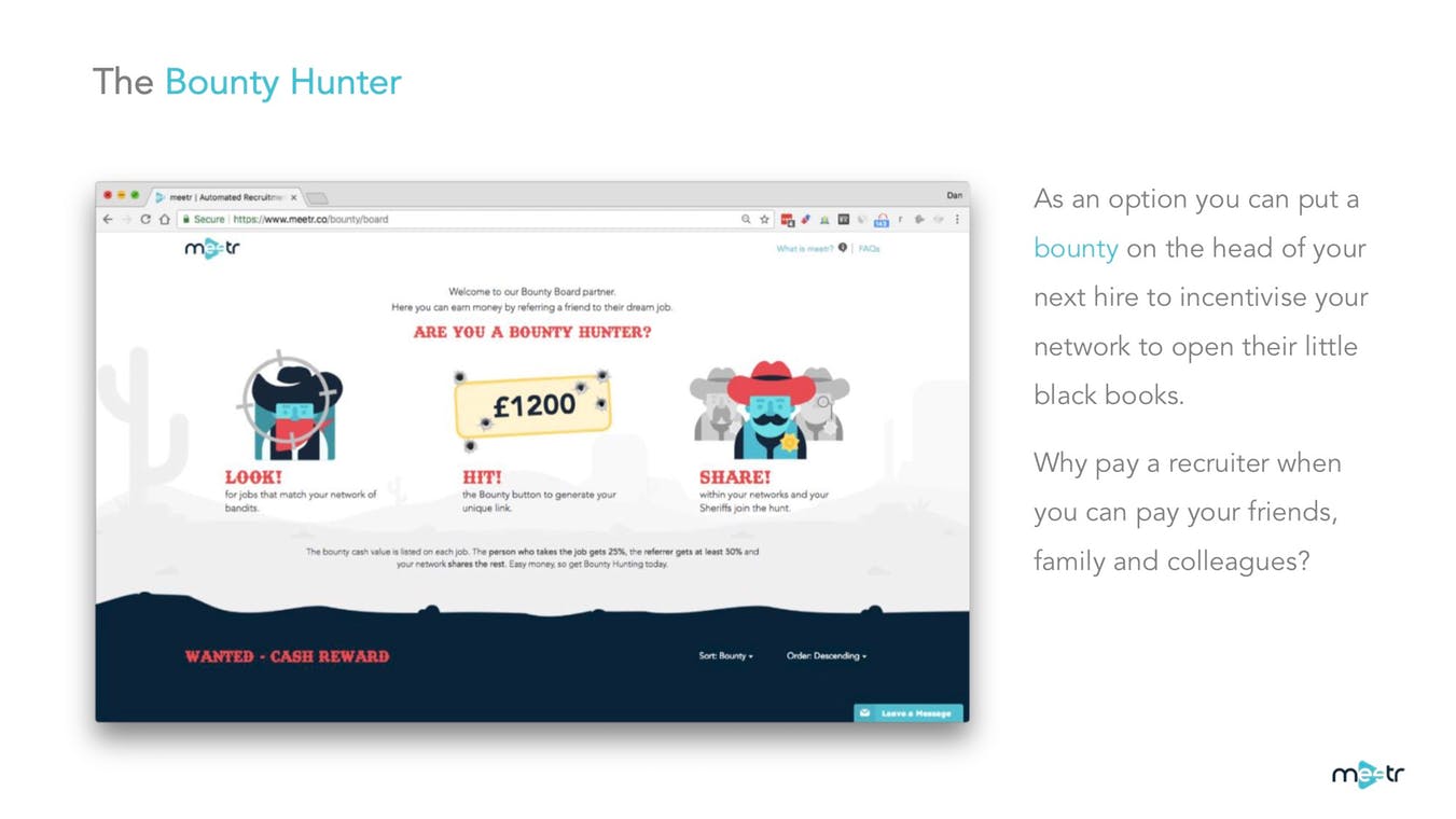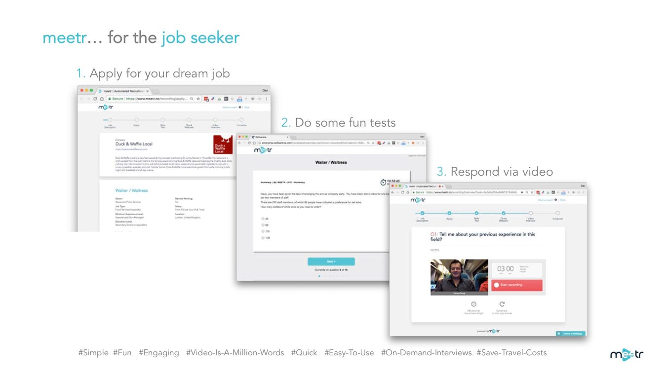 meetr is a low cost, simple to use people finding & screening toolkit. Designed to help you save time so you can focus on what makes money. Set up in minutes and can run standalone or alongside any recruitment campaign.
