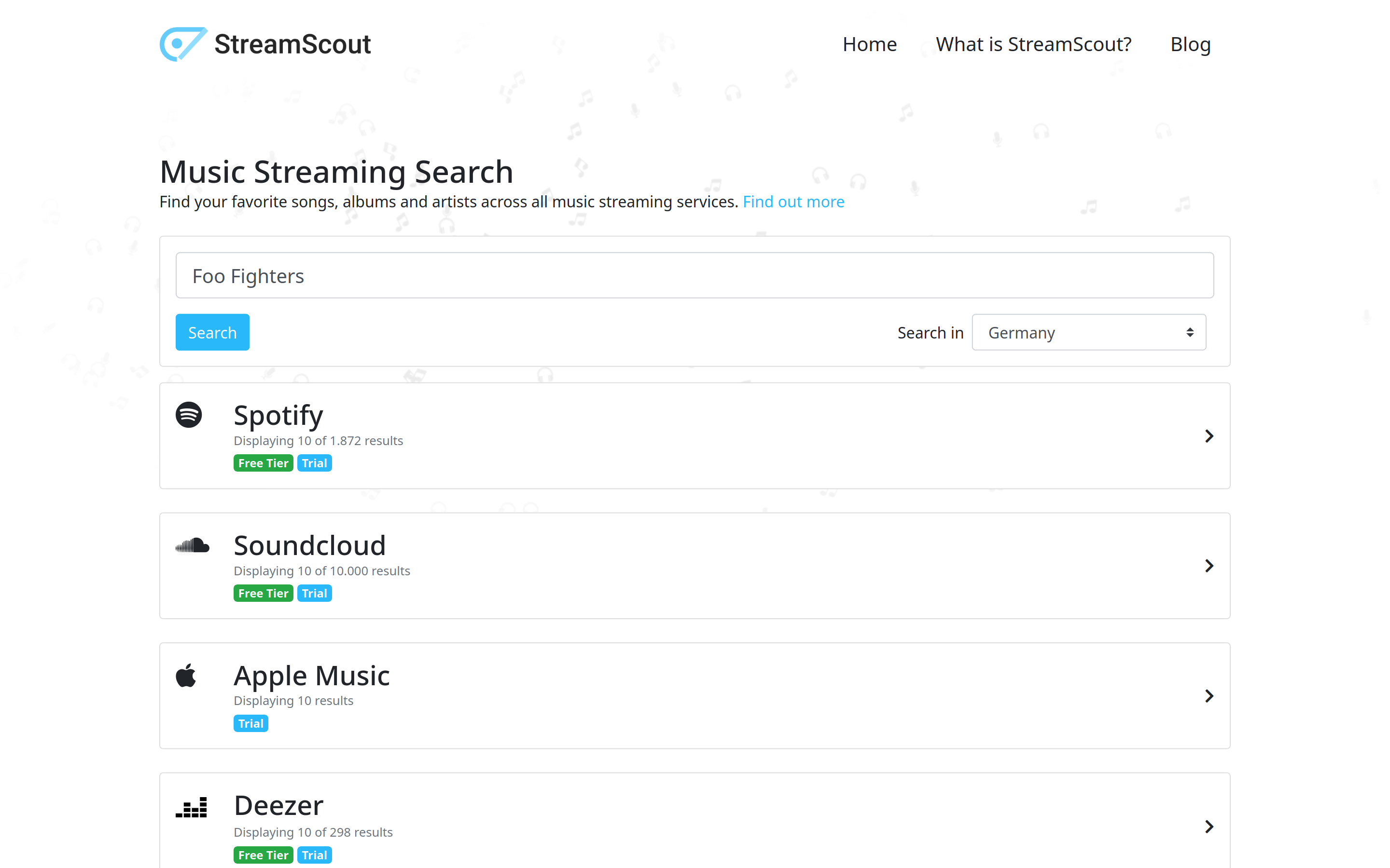 StreamScout is a search engine for music streaming services. You can search for your favorite song, artist or album and find out if it is in any library of any the major streaming services. It is especially useful when you are in the process of switching to another service. Visit StreamScout at https://stream-scout.com