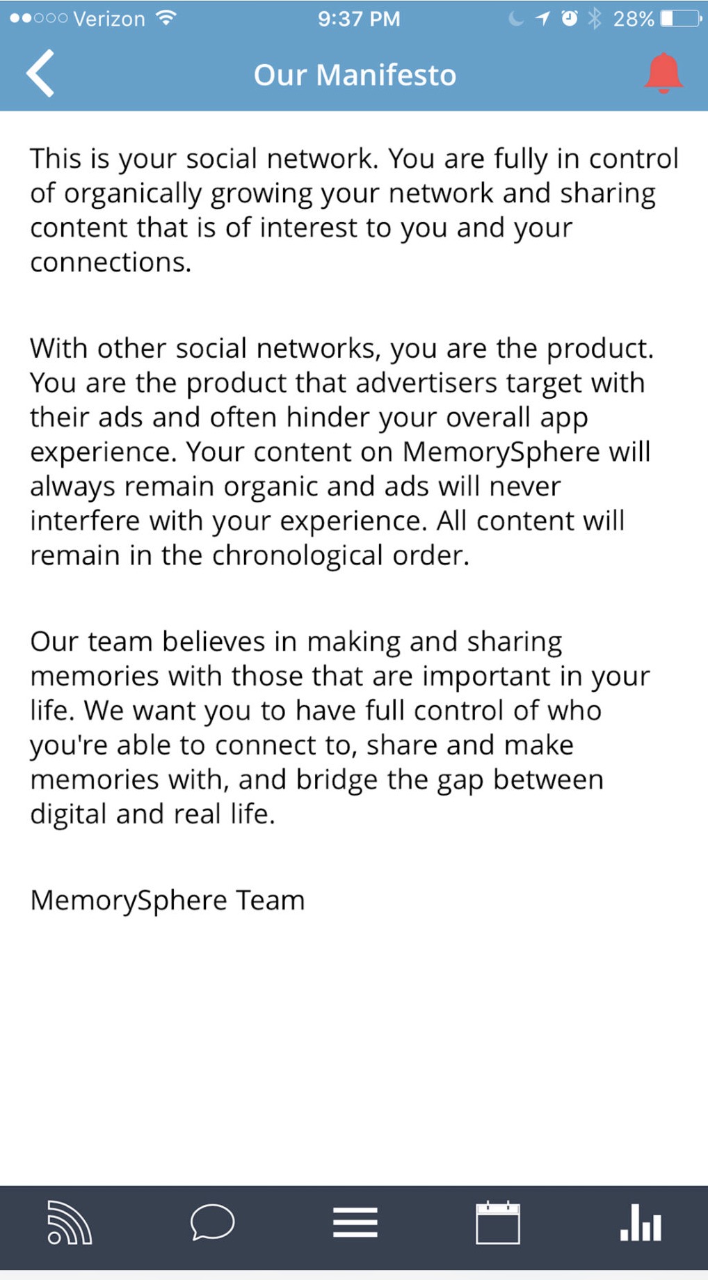 MemorySphere is a mobile social platform that eliminates unwanted background noise, keeps you in control of who and how you connect with your network, and lets you organically grow and communicate with your connections. In addition to making and sharing posts and having private chats with connections, users are able to create variety of different polls and make plans with specific and/or all of their connections. The app is currently available on iOS; Android version is on its way. You can download our app in the Apple app store - https://itunes.apple.com/us/app/memorysphere/id1190810291?mt=8