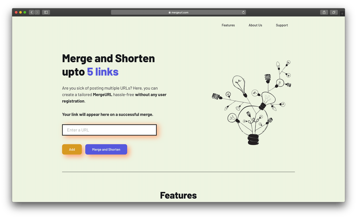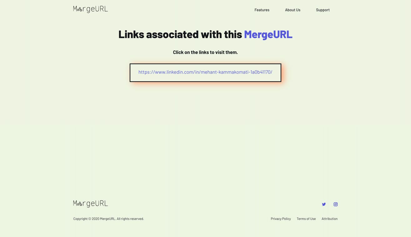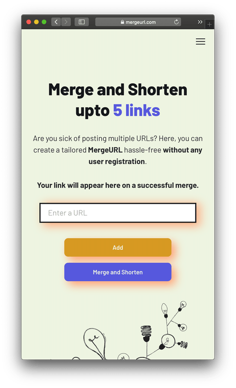 Multiple URLs belonging to the same purpose can become cumbersome to display, share, and handle. We present MergeURL, unlike other similar products, shorten multiple URLs instantly while overcoming the barriers of user registration.