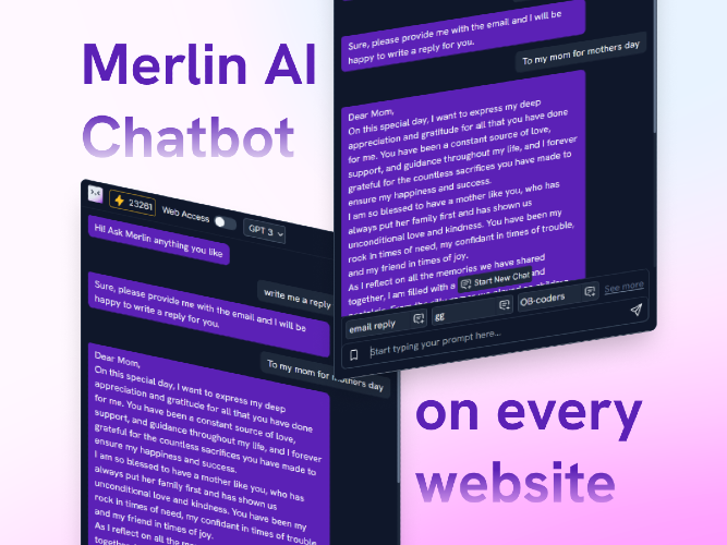 Whether you're a student, copywriter, marketer, software engineer or someone who loves to write or ask, Merlin AI is the perfect tool for you! Merlin also shows responses from Chat GPT alongside Google, Bing, DuckDuckGo, Baidu and other search engines. With just a Cmd+M, Merlin makes it easy for you to access the ChatGPT app on any website. Merlin Features: 1. Access GPT-4 for Free : Merlin provides you free access to GPT-4 power which gives you advanced ChatGPT capabilities. 2. Access AI Chatbot everywhere : Chat with Merlin on any website to get the information you need from internet without leaving the page. Merlin is always ready to help, no matter where you are on the web. 3. Summarize or Chat with PDF, PPT, or DOC: Upload your document or PDFs and get brief summaries in seconds. Be it your textbooks, papers, contracts, etc. get relevant info in seconds by summarizing or chat. 4. Unlimited Chat GPT for Google Search : Get the most relevant & concise responses alongside your Google search queries & Chat with Merlin Chatbot to get the right information on internet, without having to shift through pages of results. 5. Youtube Summary with AI Chatbot : Summarize YouTube videos with just a click using Merlin summarizer, so you watch only what matters with timestamps. Chat with the summary to get more insights from the video. 6. Grow your Social Media using Chat GPT on LinkedIn & Twitter : Boost your social media game with Merlin using AI-generated posts and comments on LinkedIn and Twitter. Merlin can help you build your personal brand by creating posts & engaging with your followers and also help you generating leads on LinkedIn & twitter with right communication. 7. Write faster and smarter emails on Gmail : Use Merlin to create or reply to emails quickly and easily on Gmail. You'll save time and get more done, whether you're at work or on the go. 8. ChatGPT with live web Access - Enabling web access mode on Merlin is a super power in itself. Get more factually accurate Chat GPT response and latest internet based data. 9. Blog Summary with AI Chatbot : Summarize any long articles or create TLDR of any blog using Merlin Chat GPT App, so you can get the information you need to make informed decisions in no time. 10. Translate ChatGPT response in Multiple languages : Choose your desired language to Chat with Merlin and get responses that are accurate and relevant, no matter where you are in the world.