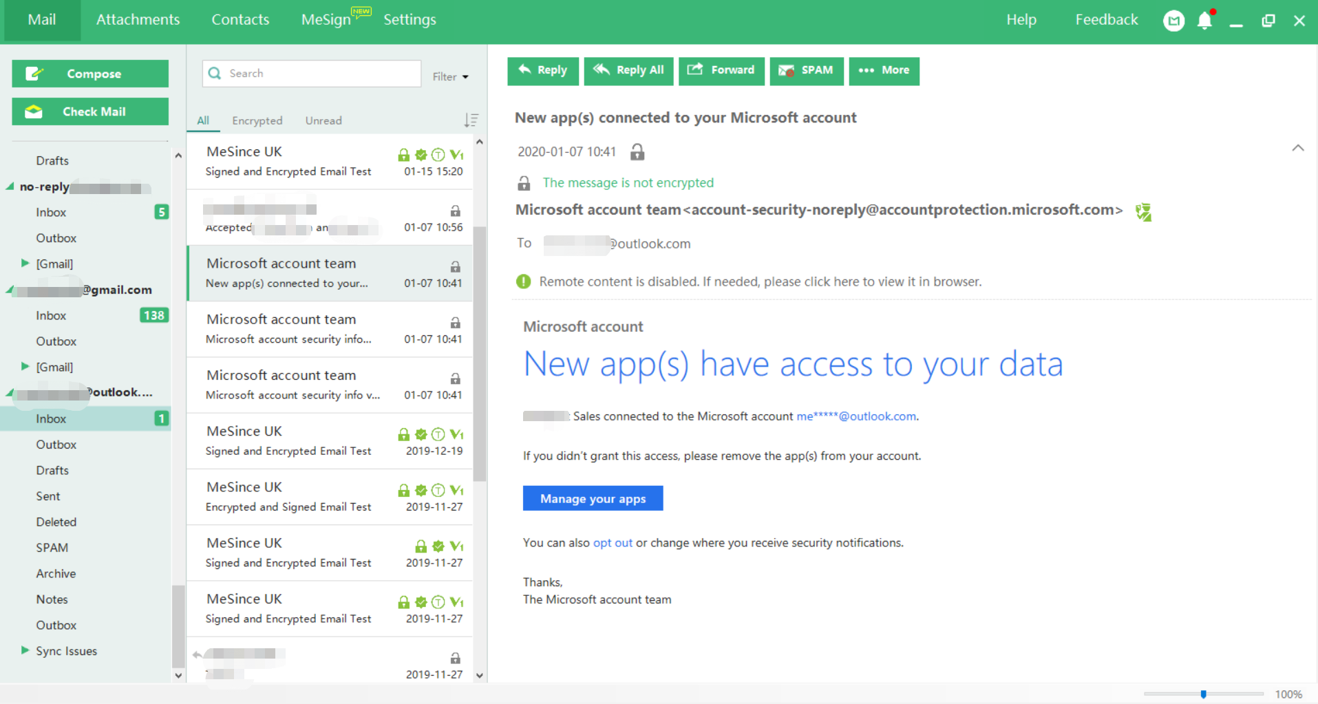 MeSince is a free email client APP with email certificate automation. Once users log in your email account with MeSince App, the forever free S/MIME certificates will be issued, installed and configured automatically. MeSince offers high-level identity validations as well to increase trust in online communications and transactions. Currently, MeSince supports Windows, Android, and iOS. All users' email data is stored encrypted on their own email server only. MeSince has anti-virus features to scan every encrypted email before the user sees the emails, to make sure all the URLs and attachments are secure when users see them. MeSince helps to protect users' privacy and helps the business to be GDPR compliant. Join MeSince and say 'No' to clear-text messages!