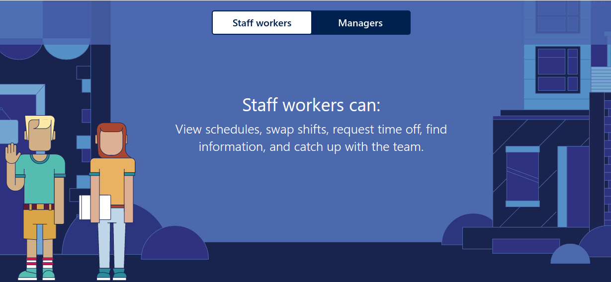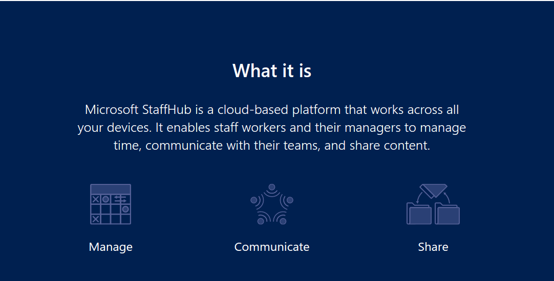 Microsoft StaffHub - is a cloud-based platform that works across all your devices. It enables staff workers and their managers to manage time, communicate with their teams, and share content. Manage Communicate Share What you need to know ? At work, on the way to work, or at home, you can always find what you need with Microsoft StaffHub.