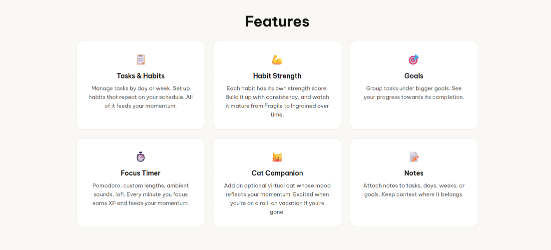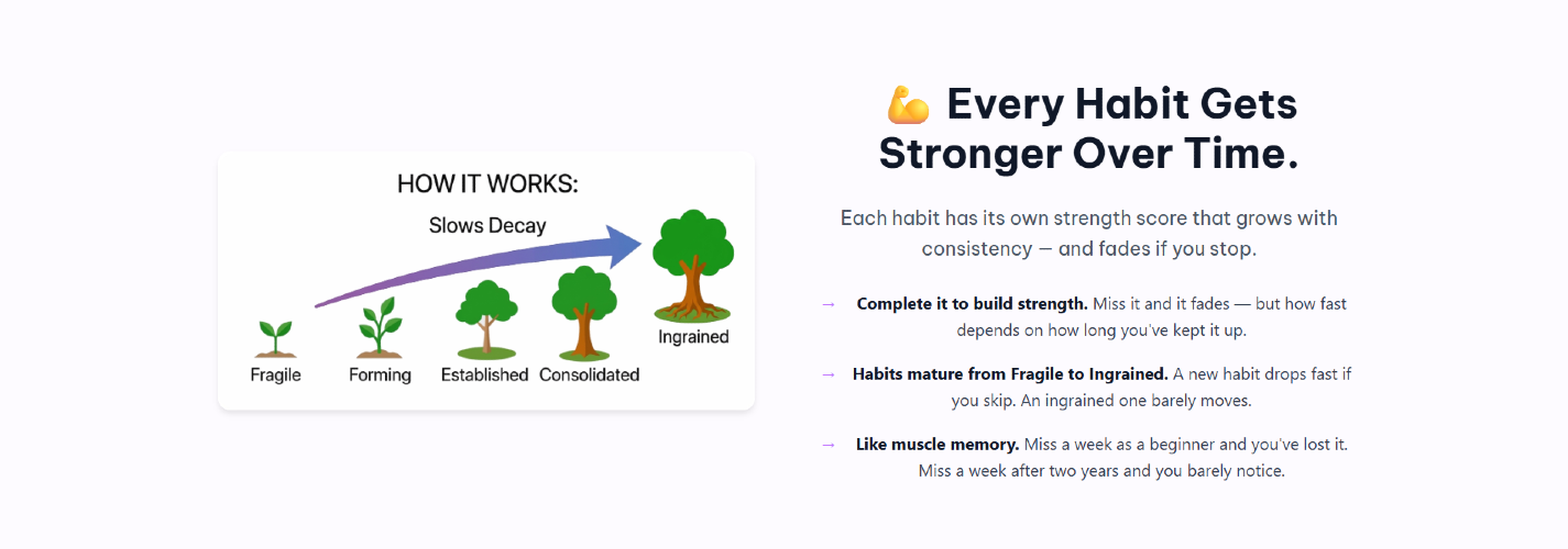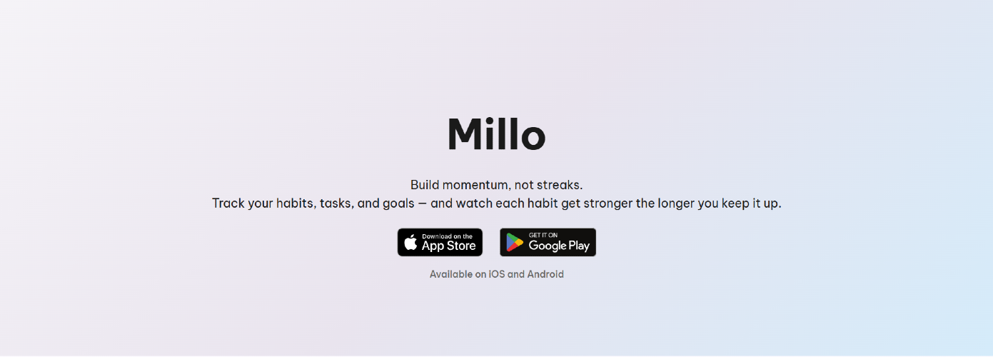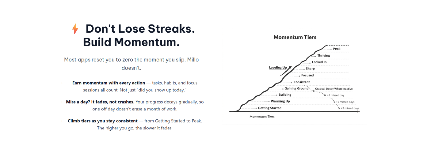 Millo is a habit, task, and focus tracker built around momentum instead of streaks. Complete habits to build habit strength. Momentum tracks your score across habits, tasks and focus sessions. Miss a day and your progress fades gradually - the more consistent you've been, the slower it fades.