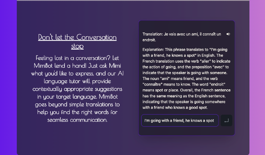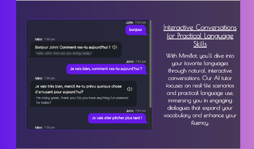 Say hello to Mimibot, your very own AI language tutor. We created Mimibot for language enthusiasts who don't have the luxury of mingling with native speakers. It's all about helping you tackle your favourite language, and getting you to a conversational level as swiftly as possible. At the heart of Mimibot is our belief in immersive learning. We don't just throw words and grammar rules at you - we involve you in the language, through meaningful conversation. You won't just learn a language, you'll live it. Mimibot is like a friendly chat with someone you've known forever, not an intimidating lecture. Mimibot, or 'Mimi' as we like to call her, is ideal for anyone starting out or still finding their footing in a new language. She'll give you that confidence boost you need to strut your language skills without hesitation. Think of Mimi as a helping hand, guiding you across those language hurdles that seem a little too high to jump alone. So, why not give Mimibot a try? Mimi can't wait to meet you and get those conversations rolling!