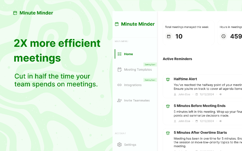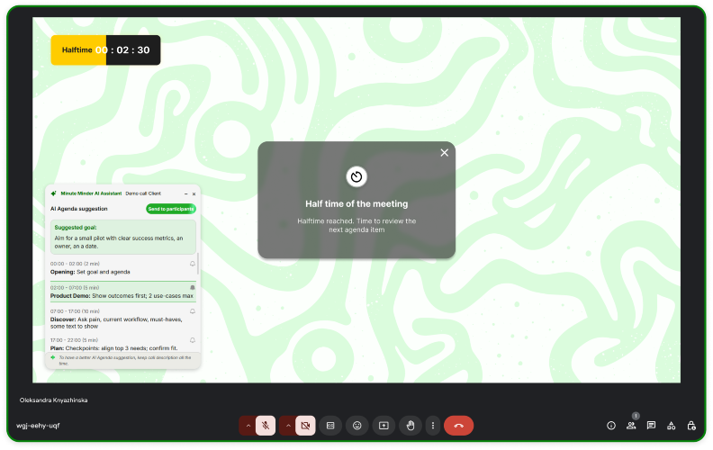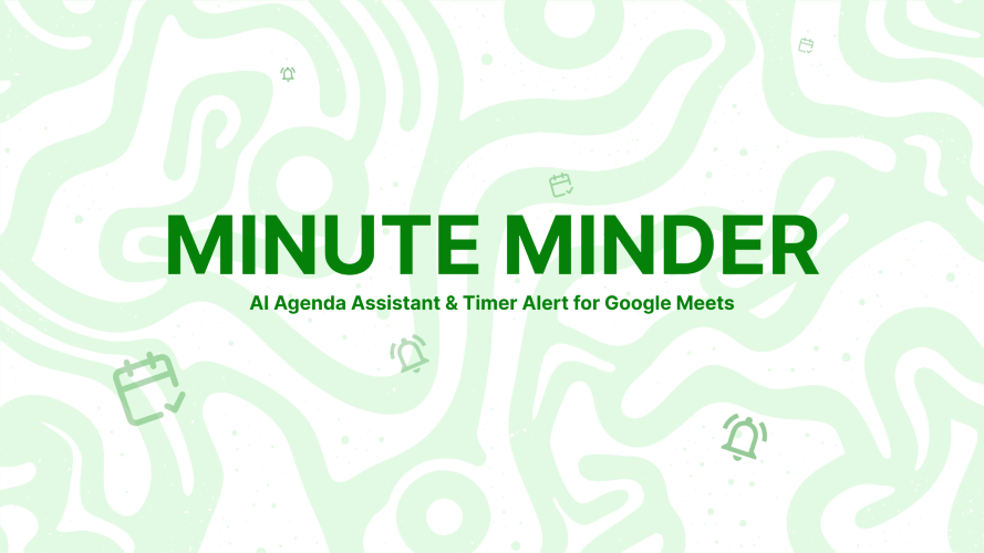 Minute Minder is an AI Agenda Assistant for Google Meet. It helps you avoid running overtime with a timer and alert system, and keeps meetings clear and focused by using AI to organise everyone’s speaking time. The simple idea - join a meeting like you always do, but now you have a quiet co-host that does two jobs automatically: - AI Agenda Assistant: it gives the meeting a structure that fits the time - Timer: it keeps time visible so the group stops drifting The value is: AI turns a calendar invite into a timeboxed plan, and the timer nudges the meeting to move forward when it normally stalls. With an AI Agenda Assistant next to the meeting, you don’t start from scratch. You start with a clear goal and a sequence that fits the time you booked. And because you can share it, everyone is aligned early, not after 20 minutes of context switching Timer performs the tedious task humans dislike. It makes time visible, and it gives you prompts at the exact moments where calls usually drift: when you’re halfway through, when you’re running out of time, and when overtime begins.