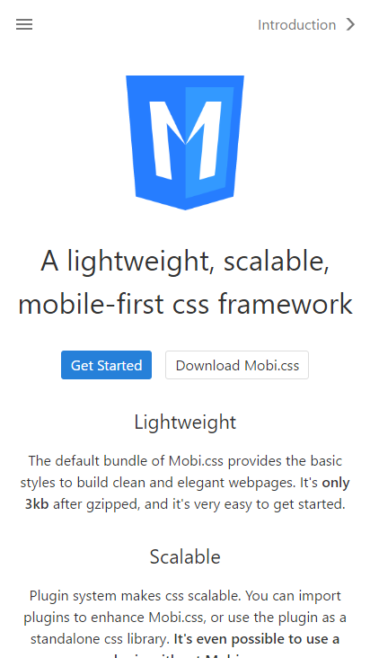 A lightweight, scalable, mobile-first css framework ## Lightweight The default bundle of Mobi.css provides the basic styles to build clean and elegant webpages. It's only 3kb after gzipped, and it's very easy to get started. ## Scalable Plugin system makes css scalable. You can import plugins to enhance Mobi.css, or use the plugin as a standalone css library. It's even possible to use a plugin without Mobi.css. ## Mobile-first Mobi.css focus on the details and provides the best user experience, especially for content-rich webpage. It's designed for mobile, but also works awesome on desktop.