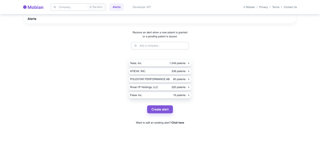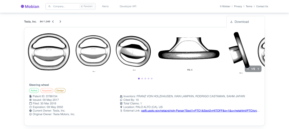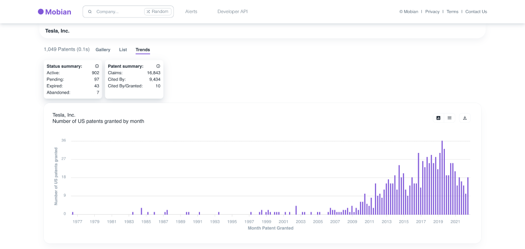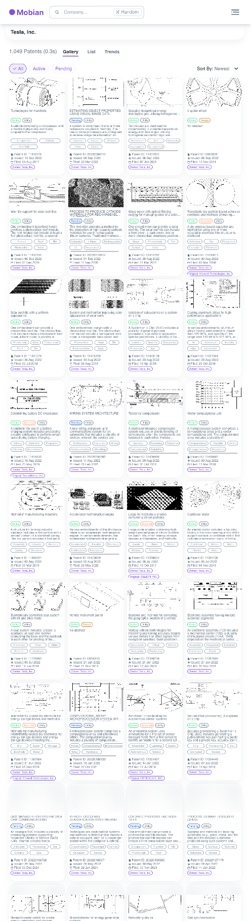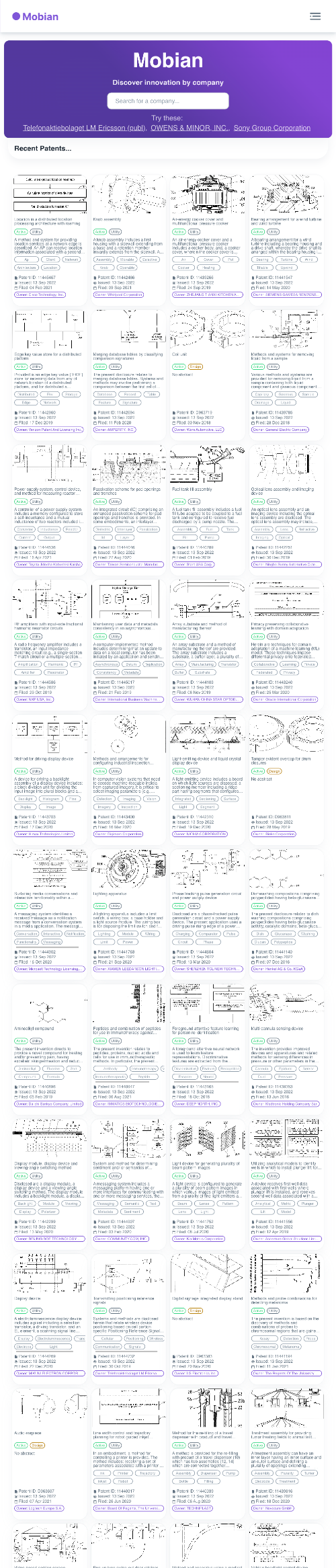 Mobian.dev is a free visual search engine for U.S. patents. We believe innovation, with patents as one example signal, is a critical area of understanding for every company. Our visual search engine powers innovation discovery by company and industry. With our newly released tools, you can see trends in filings, pending patents, and get text or email alerts for any company. Use our AI-powered keywords to see automated analysis of every U.S. patent currently in-force. Find similar patents or analyze areas of interest for a particular company. Our AI automatically runs on every newly granted and pending patent the moment they are released. For developers, use our API to pull your own data and discover your own insights. And, we have built our site to be fully functional on mobile or desktop. We hope you’ll try it out and share your feedback!