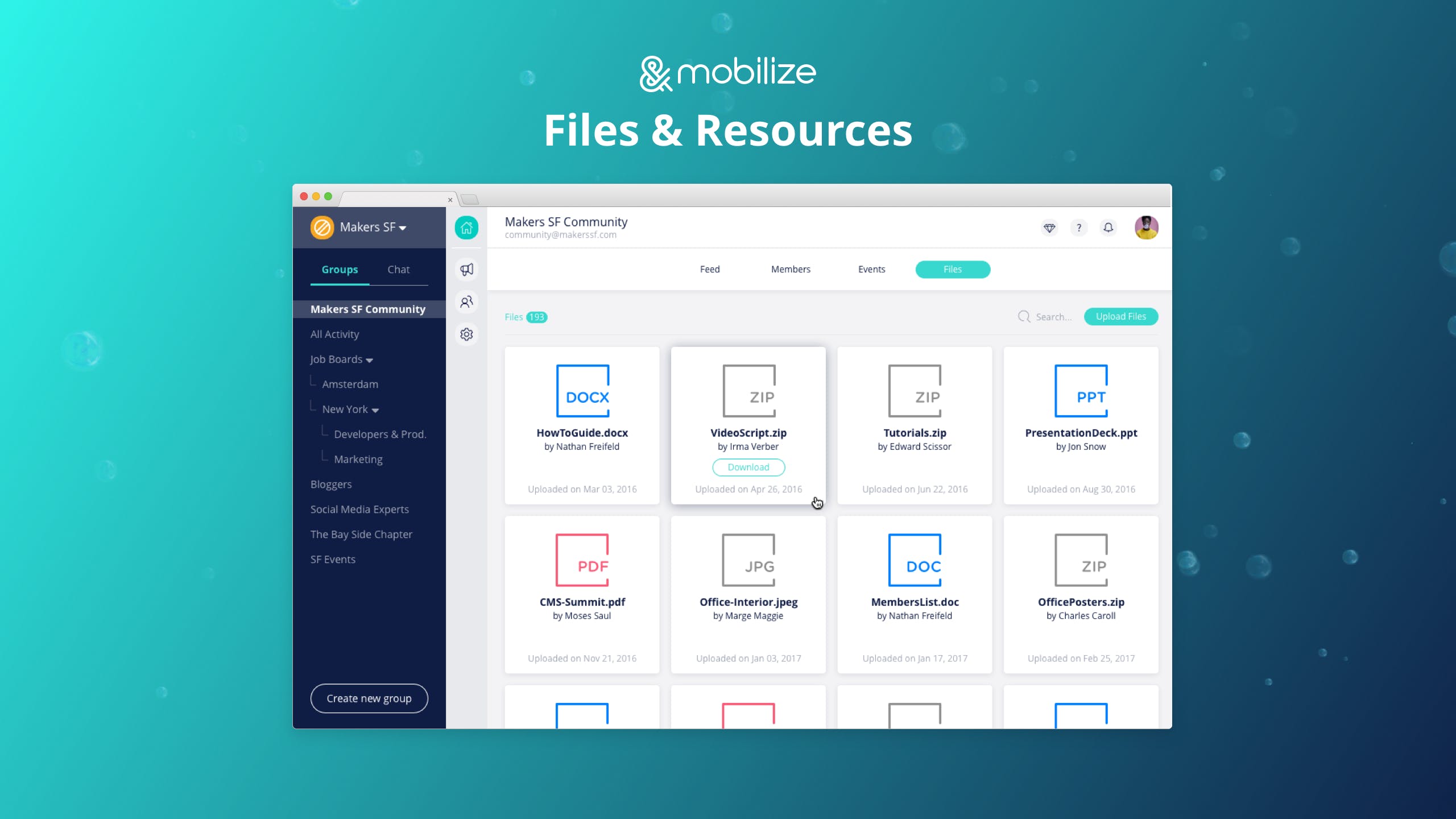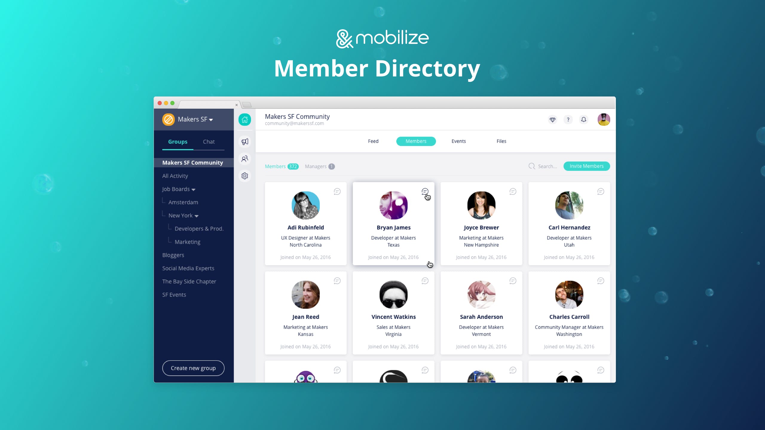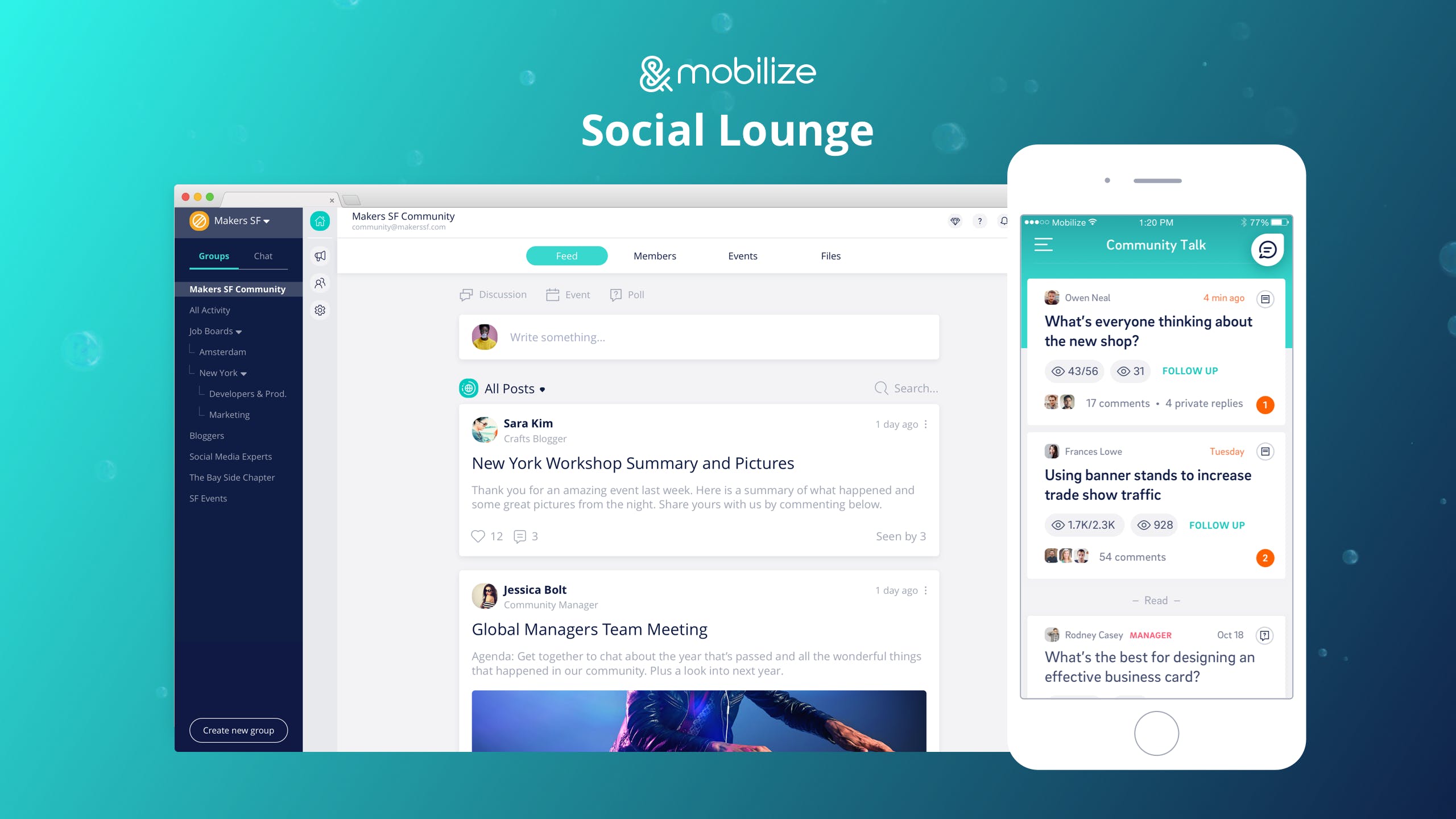 Mobilize 2.0 is an online home for you What’s different about Mobilize 2.0: 1. The Lounge - a home for your community to meet, network, access community resources, attend events, engage with polls, share ideas and so much more. Checkout our feed - we combined best of both words - threads and live chat! 2. The Members Directory: Members can find each other by tags and connect with each other by creating private or group chats. 3. Events & Files: Members can opt-in to upcoming community events and have them sync to their personal calendar. Getting also a resource center where managers and members can add and share files with each other. 4. Outreach Center - Create email blasts, meeting invites, send text messages that can be sent to everyone or targeted with smart segmentation and personalization with animated GIFs, images, links, CTA buttons and merge tags. 5. Member Database - Your place to own, organize and manage your community members with advanced features, filters and actions.