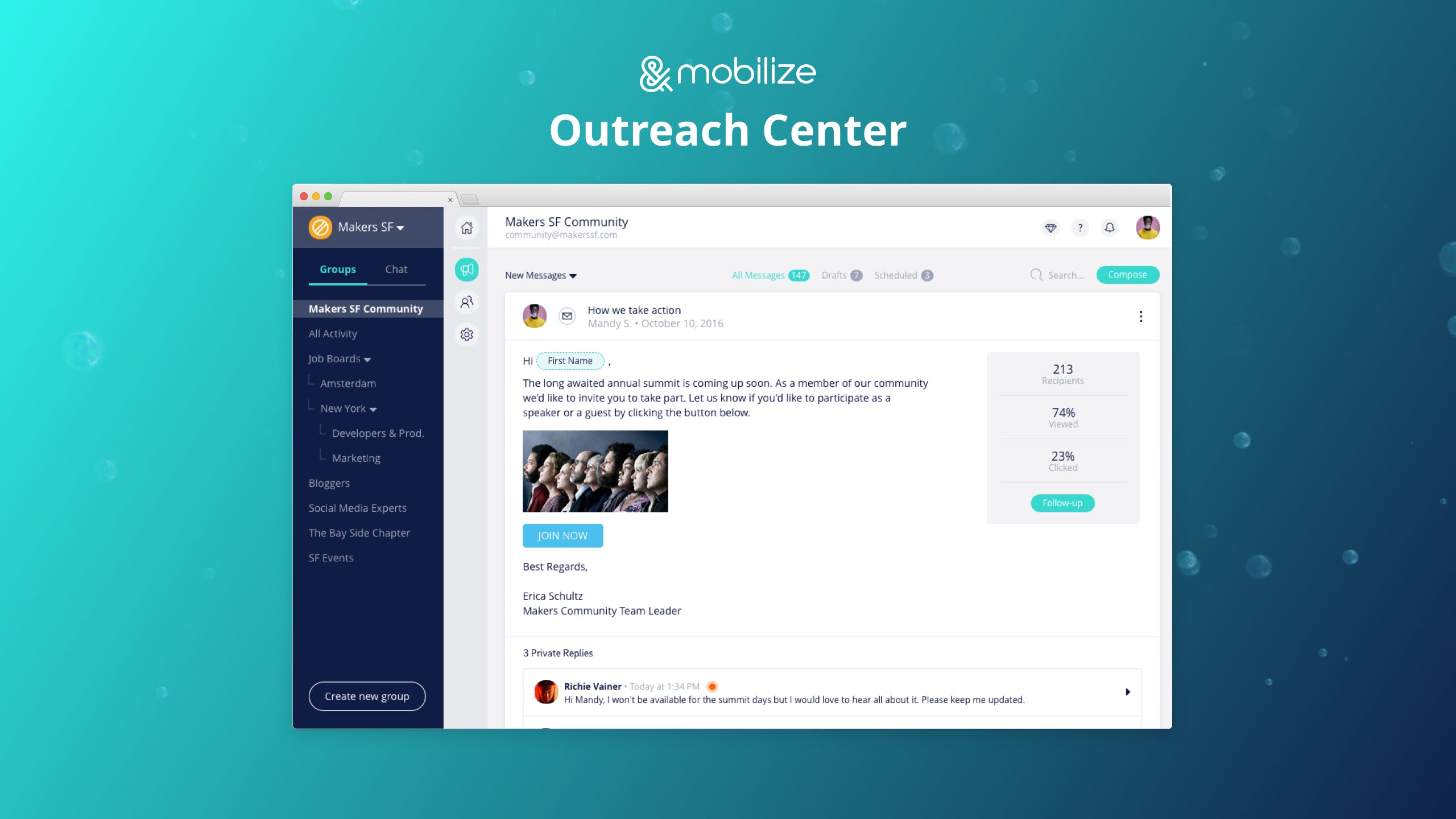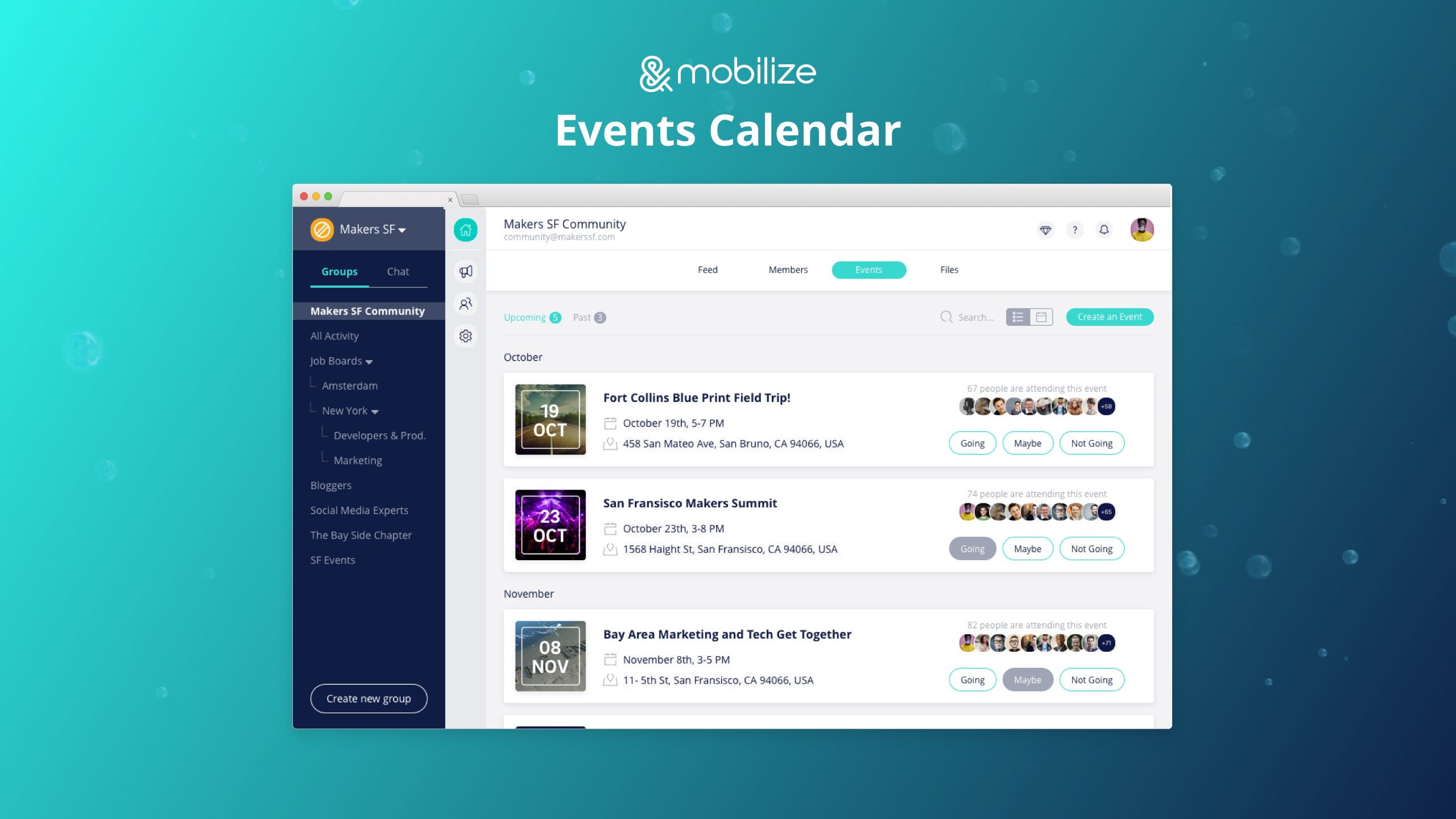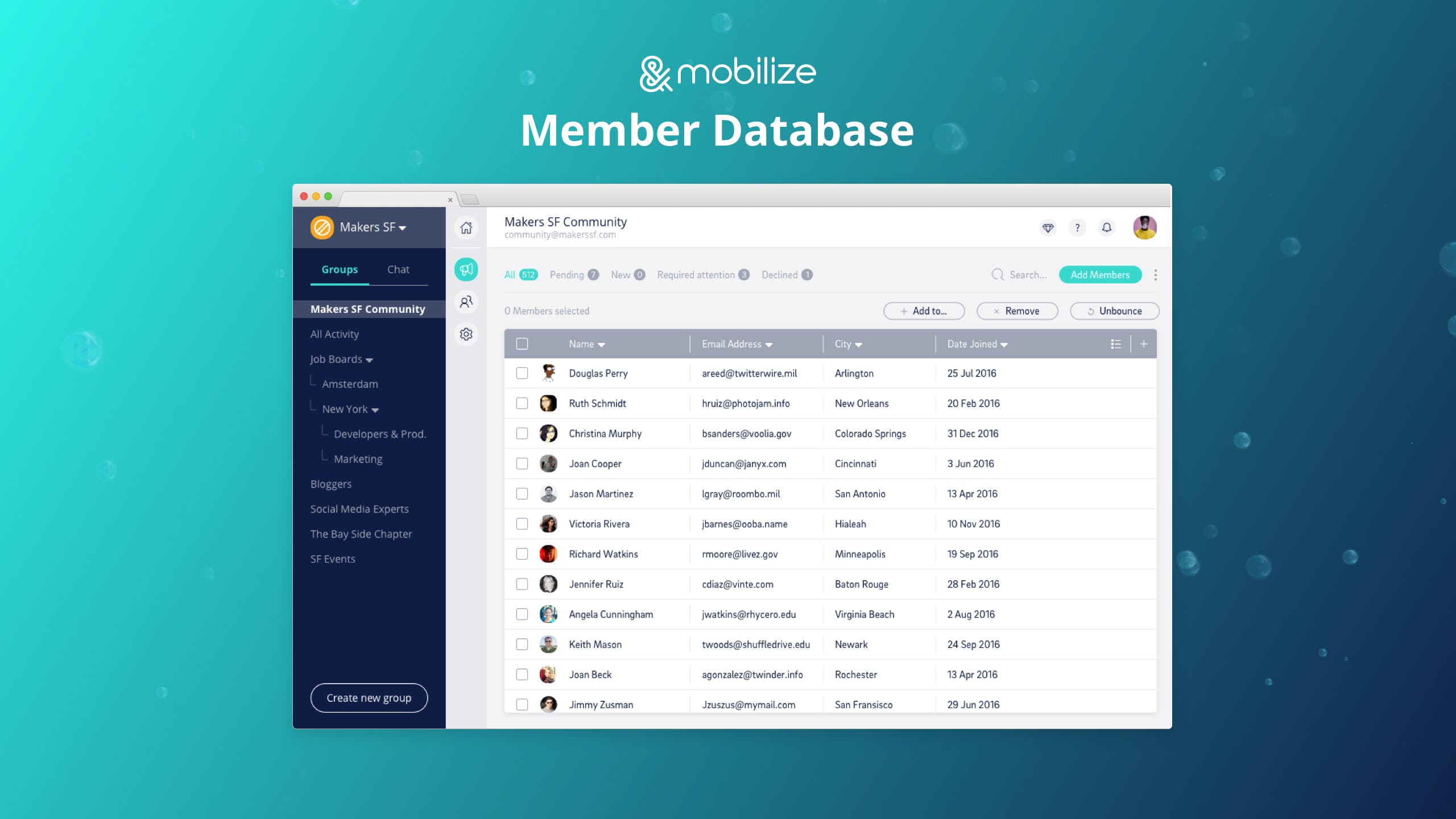Mobilize 2.0 is an online home for you What’s different about Mobilize 2.0: 1. The Lounge - a home for your community to meet, network, access community resources, attend events, engage with polls, share ideas and so much more. Checkout our feed - we combined best of both words - threads and live chat! 2. The Members Directory: Members can find each other by tags and connect with each other by creating private or group chats. 3. Events & Files: Members can opt-in to upcoming community events and have them sync to their personal calendar. Getting also a resource center where managers and members can add and share files with each other. 4. Outreach Center - Create email blasts, meeting invites, send text messages that can be sent to everyone or targeted with smart segmentation and personalization with animated GIFs, images, links, CTA buttons and merge tags. 5. Member Database - Your place to own, organize and manage your community members with advanced features, filters and actions.