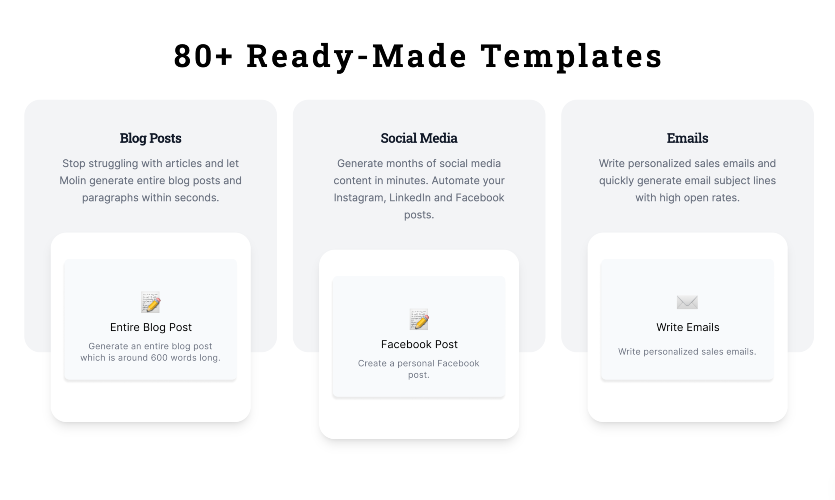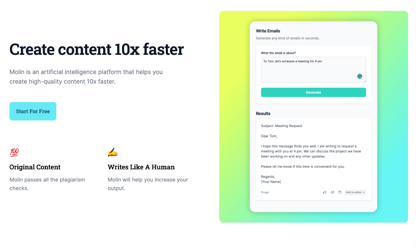 Molin is an AI copywriter that focuses on non-English speakers. Today, we support 10 languages and seamless cross-language operations. 🗺️ Creating quality content in multiple languages has never been easier! 🤑 We offer an unlimited free plan and our pricing is simple. Molin is an affordable alternative to Jasper and CopyAI.