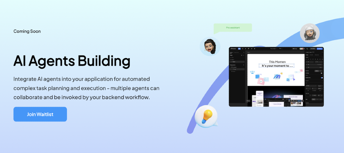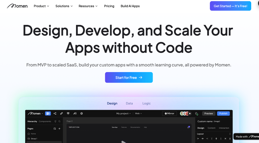Momen is a no-code web app builder that allows users to build fully customizable web apps. With Momen, you'll efficiently move from prototype to app deployment with a strong built-in backend. Iterate rapidly without coding, ensuring predictable costs with project-based pricing. Achieve assured scalability through advanced collaboration workflows for custom million-user projects from the outset. What's more, Momen's launched AI feature, enabling users to build AI-powered apps based on their business context. Beyond template-based AI bot, you can tailor your GPT's UI, create your exclusive workflow and more.